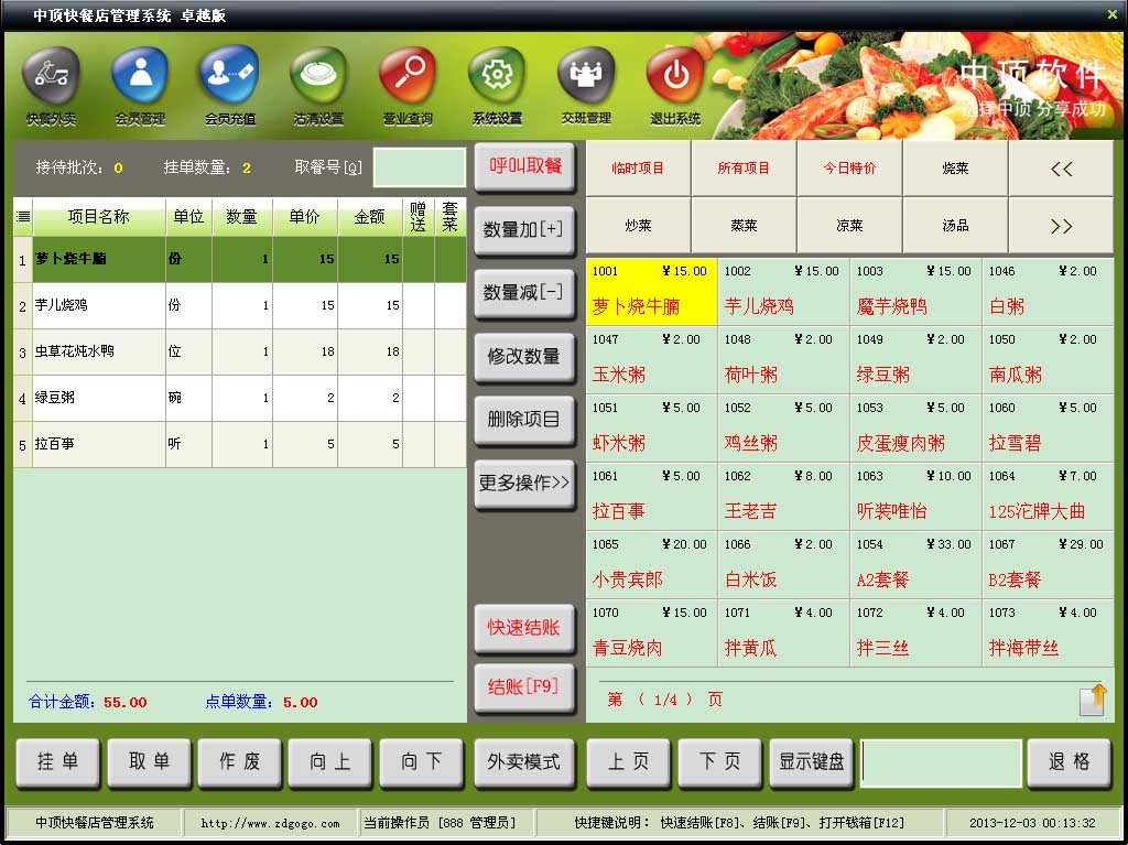 中顶快餐店管理系统是一款餐饮行业管理软件,专门针对快餐进行管理,支持计费、收银、预结、套餐、会员、打折、储值、刷卡等功能,使用方便。 软件特色 中顶快餐管理系统全面革新并明确了快餐综合管理的概念和范畴,将内部嵌入式计算的准确和即时性与外部网络管理的便捷与灵活性进行了完美的结合,从而使管理者可以更自由、更准确、更便捷地对会员、顾客档案,商品库存,财务状况和其他各种经营情况进行动态追踪管理。针对快餐经营管理特点设计的最专业的计费、收银、预结、套餐、会员、打折、储值、刷卡消费解决方案。系统功能全面,点单、挂帐、结帐简单易学,会员个性化管理自由设定,后台监控、报表统计是您经营管理的最佳助手。适用于中西式快餐、炸鸡店、自助餐厅、奶茶店、美食城、酒吧等大中小型餐饮企业。 功能介绍 1.宾客点菜消费:对于在店消费宾客,选中菜单中的商品增加到宾客消费列表中。 (1)增加菜品默认数量为1,可通过快捷键‘+’或‘-’来快速增加或减少消费数量; (2)删菜:新增菜品在未落单前允许直接删除; (3)退菜:已落单菜品,如果要取消此菜品,可以通过退菜操作解决; (4)赠菜:对宾客消费的指定菜品免费赠送时,直接点赠菜操作即可; (5)转台:将当前餐台中的指定菜品转送到其它餐台; (6)催菜:打印催菜单据到后厨,厨房可以优先处理催菜单据中的菜品; (7)漏打:但厨房没有收到个别菜品的后厨打印小票时,可以通过此功能再次打印; (8)临时菜:菜谱中没有的菜,但可以根据客户要求制作,此时用临时菜来记录客户的点菜要求; (9)挂起、解挂:在点菜结束后,宾客要求先撤销点菜或等要求时再上菜,此时可以将已点菜品挂起,等客户要求开始制作时再解挂这些菜品即可; (10)落单:表示确认提交当前点菜清单,并结束本次点菜。 2.宾客离店结账 (1)直接输入宾客支付的现金金额结账,如果宾客同时用储值卡或代金券等其它付款方式结账时,直接点击相应的付款方式按钮即可; (2)支持会员结账,享受一定的会员价或会员折扣,以及会员的积分等; (3)支持会员挂账; (4)方案折:是有管理员事先设置好的优惠规则,结账时只需要选择相应的方案折即可; (5)任意折:无约束,可以随意的更改消费项目的优惠折扣; (6)支持免单操作,即在结账时直接免付部分付款金额。 |