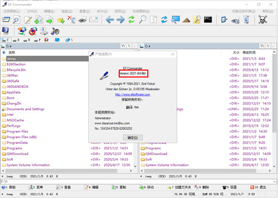 EF Commander中文版是一款功能强大的windows文件管理软件,支持包括中文在内的多国语言。EF Commander中文版由双窗口组成,你可以通过树状的档案目录搜寻文件,使用快捷方便,是一款很不错的文件资源管理工具。 软件功能 1、【易于使用】 现代化的界面可帮助您完全控制文件和文件夹。 2、【选项卡式界面】 仅定义每个窗格中文件夹和文件所需的视图。 3、【内置的媒体播放器】 EF指挥官有播放列表,并支持ID3标签功能齐全的喜质量的音频播放器。在背景中播放资源较少的MP3,Ogg / Vorbis,FLAC,WMA和WAV。Winamp插件可以播放更多格式。 4、【Multirename工具】 多功能功能,可在处理步骤中舒适地重命名多个文件。使用灵活的概念来明确定义重命名规则,包括MP3文件和EXIF信息的规则。 5、【缩略图】 快速轻松地获得您的照片或其他图像集合的概述。 6、【并行文件操作】 所有长操作都与多任务一起运行。您可以同时运行任何数量的不同操作,或同一操作的多个实例-例如,您可以同时运行多个“复制”命令。 7、【使用Windows CE】 EF Commander直接链接到PDA是全球首个具有此功能的文件管理器。处理数据的方式与台式机或笔记本电脑上的处理方式相同。 8、【需要直接从EF Commander】 Nero Burning ROM(www.nero.com)刻录CD和DVD。 9、【用于20多种存档格式的内部打包程序】 使用EF Commander可以以任何常见的存档格式打包文件或整个文件夹。无需外部程序。 支持的格式:7-Zip,ACE,ARC,ARJ,BZIP2,CAB,CPIO,GZIP,IMG,ISO,LHA,RAR,RPM,SFX,SQX,TAR,TAR.7Z,TAR.BZ,TAR.GZ,TAR .XZ,UDF,WIM,XZ,Z,ZIP,Zip64,ZOO。 10、【用于多种文件格式的内部查看器】 查看图片文件和电影,并播放MP3,Ogg / Vorbis,FLAC,WMA和WAV音频文件,而无需使用任何其他软件。 11、【使用XnView和IrfanView作为附加组件】 将可用格式的数量增加到400或更多。EF Commander在后台安静地运行,但仍可完全使用。文件也可以在内部查看器中,以快速查看模式或作为缩略图进行管理。 12、【快速FTP / SFTP / FTPS / SCP客户端】 内置的FTP / SFTP / FTPS / SCP客户端功能可恢复下载和FxP(服务器到服务器的传输),安全连接。 13、【内部文本和HEX编辑器】 EF Commander具有仅用于系统资源限制的文件的全文和十六进制编辑器。 14、【拆分/合并大文件的功能将大文件】 拆分为较小的部分,然后重新组合这些部分。 15、【创建/验证校验和】 检查数据的完整性。EF Commander支持SFV,MD5和SHAx格式。 16、【同步功能】 将笔记本或LAN与工作站同步。 17、【对打包程序,查看器,文件系统和内容】 外部插件支持通过外部插件扩展EF Commander的功能。支持的格式包括WLX,WCX,WFX和Winamp解码插件。 安装方法 1、从本站下载解压后,即可得到EF Commander 2021中文源程序和修改文件; 2、双击“EF_Commander_2021.exe”文件运行; 默认安装路径,创建桌面快捷方式,点击OK即可开始安装; 3、待弹出提示安装成功,点击确定退出安装向导即可,暂不运行程序; 4、接着打开Crack夹运行“KeyMaker.exe”注册机文件,先点击生成按钮; 5、再点击保存EFCW.LIC,弹出提示生成成功,点击确定; 6、此时,在Crack文件中会生成一个EFCW.LIC文件,然后将此文件复制粘贴到软件默认安装目录中即可; 默认安装目录为【C:Program Files (x86)EF Commander】 7、至此,软件即为安装激活成功,再运行程序,点击桌面options,选择language; 8、弹出语言设置框,选择简体中文,点击确定即可; 9、以上,便是EF Commander 2021中文修改安装教程,欢迎下载。 |