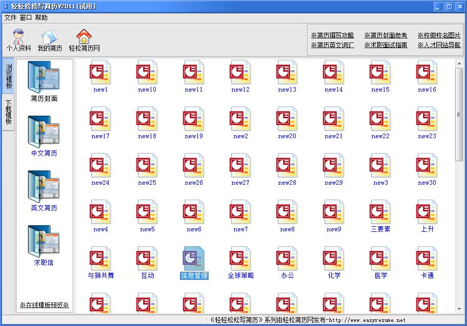 轻轻松松写简历软件是一款应用广泛的写简历软件,轻轻松松写简历官方版内置数百个各种精美样式中文简历、英文简历、中文求职信、英文求职信和简历封面模板,轻轻松松写简历最新版可根据模板自动生成各种风格不同样式的个人简历,可制作,保存多份简历,修改、编辑等操作。 软件功能 轻轻松松写简历》内置数百个各种精美中英文简历及求职信, 简历封面Word文档模板,操作简单,上手容易, 精美简历一天就做好!考虑到编辑,打印的方便性; (在任一个打印复印店,都安装有Microsoft Office); 《轻轻松松写简历》全面兼容Office Word, 用《轻轻松松写简历》制作的简历可以在word中任意编辑打印。 安装方法 在系统之家,下载轻轻松松写简历最新版软件包,解压,运行“exe.文件” 双击打开,进入安装向导,单击下一步; 继续安装前阅读协议,点击我接受; 选择安装位置,默认c盘,点击安装; 轻轻松松写简历最新版正在安装,耐心等待一下; 安装完成,点击完成,退出安装向导。 使用方法 首先填写个人资料。 在主界面模板面板窗口中双击你想编辑的模板,可以进入编辑状态; 编辑完成后可以保存模板; 导出模板存为Word格式,起一个文件名保存文件即可,导出的文件可以在任意一文印店打印; 通过“下载模板”功能在线更新下载更多的简历模板。 更新日志 1.修复BUG,新版体验更佳; 2.更改了部分页面。 |