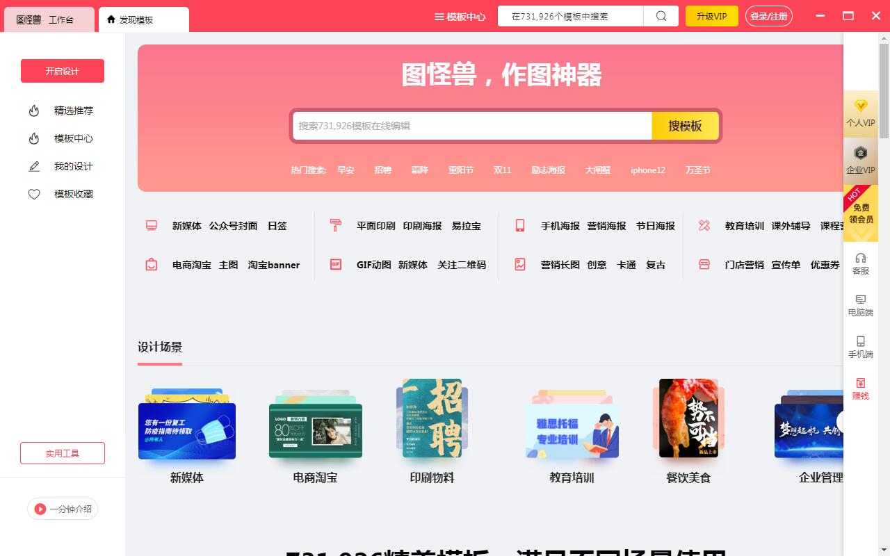 图怪兽是一款好用的平面设计图片制作工具,内含丰富的素材及模板,可以帮助用户设计不同风格的海报及图片,能够满足不同的用户需求,它让你搞定平面设计不求人。 功能介绍 1、特效字。 2、线条形状。 3、表情包。 4、图库-包括文案排版、艺术字、贴纸、图片、背景、摄影、人物。 软件特色 1、海量精品模板 覆盖新媒体运营、平面印刷、电商淘宝、工作文档、日常用图等丰富的场景。 2、云端存储 作品自动保存到账号,极简管理、不怕丢失、随时再次开启设计。 使用方法 1、点击“模板中心”进入模板页面,或是通过网站站内的搜索功能搜索出自己喜欢的模板类型。 2、然后将鼠标箭头放置自己喜欢的模板图片上会显示“在线编辑”四个字,点击过后即可进入到图怪兽编辑器页面。 3、选中图片中的文字即可对图片中的文字进行更改,同时在右边栏上面可以对文字调色、变换字体和大小调整等操作。 4、文字更换完毕后又可以在左侧增加特效字、线条形状和表情包等操作;如果自己有本地的图片也可以通过上传来对图片进行相对应的设计。 5、最后做好图片过后点击右上角的“无水印下载”,没有登录的可以使用QQ或是微信进行登录,登录完毕后即可对图片选择JPG或是无损PNG格式下载。 更新日志 1、一键拖拽即可上传图片,快捷键复制粘贴,作图更方便! 2、画布尺寸精确到厘米,印刷物料更省心。 3、每次浏览都有记录,找模板超快。 4、升级VIP无需全额,补完差价再付款,划算哭了。 5、编辑所见即所得,做好图放心下载吧。 |