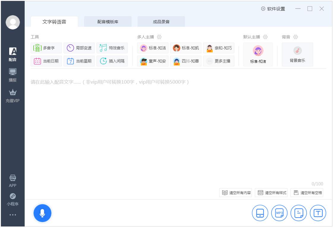 知意配音软件是一款文字转语音,AI语音编辑软件,能很好的帮助用户识别文字,转化为语音,这款软件有着海量主播音效,能够帮助用户轻松制作出各种配音内容,支持背景音调节,多样模板可选,支持特效音。需要的快来下载吧。 软件特色 1、叫卖录音 海量叫卖录音模板,可快速套用,通过丰富的工具快捷创建自己的叫卖录音。 2、自媒体生产 通过插入停顿、切换播报人、插入特效音等功能可轻松创作多彩多样的音频作品。 3、剪辑合成 只需文案及配图即可通过知意快影生成视频文件,告别复杂的剪辑工作。 4、文稿创作 知意文稿可将录音及视频文件及快速准确的转换为文字,实惠且高效。 功能介绍 1、多角色的情景对话 输入对话内容,然后根据不同角色选择不同的主播声音,实现情景对话的效果。 2、多音字功能 在选中文字以后,点击上方的“多音字”,就会出现这个字的所有读法,然后选中你想要的读法就行了。 3、局部变速 在选中文字以后,点击上方的“局部变速”,会有0.9到2.0的语速选择,一段话中也可以使用不同语速啦。 4、特效音乐 对于全方位丰富音频内容的用户,直接点击上方的特效音乐就能选择你想要的特效音。 5、多种间隔选择 多种间隔选择,从0.1s到10s,一共九种停顿时间,大家可以更快的添加停顿。 6、快速添加当前日期 很多场景下都需要添加日期,现在就能一键添加当前日期和当前星期啦。 7、网页制作,手机试听 如果因为各种不可抗力,你的电脑无法播放声音,那也不用着急,右下角的第一个按钮“手机试听”就能解决,点击会出现一个二维码,打开微信扫一扫,就能直接在手机上试听。 8、保存至我的作品 制作的音频还能保存到我的作品,不用下载到电脑,更不会丢失。随时需要,随时下载。 |