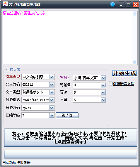 炫勇语音自动生成器是一款非常不错的文字处理工具,这款软件功能齐全,可以将文本文字换化成音频格式的文件,支持当前流行的音频格式,用户在这可以自由的调节语速,发音人,音频格式,音量大小等相关参数,让生成的音频文件更合你意。 软件参数 使用这款软件转换语音之前可自定义引擎类型、文本编码、文本类型、音频格式、音频编码、压缩等级、发音人、背景音、语速、音量等选项。 功能介绍 使用语音自动生成器转换语音之前可自定义引擎类型、文本编码、文本类型、音频格式、音频编码、压缩等级、发音人、背景音、语速、音量等选项。通过该软件制作免费的语音可以用作mc喊麦说话开场,也可以录制文字表白情书。生成的语音文件在软件运行目录! 使用方法 1、勾选保存语音文件; 2、在文字编辑框输入内容-------设置想关参数-------开始生成; 3、生成的语音会在软件的同级目录显示。 |