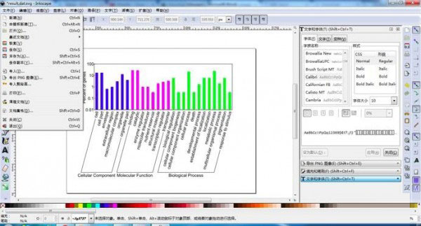 5、图像填色,使用工具 ,首先按住“shift”键进行多项选择“cellular component”相对应的柱状,然后单击调色区选择填充颜色,以此类推完成‘molecular function’ 和‘biological process’ 图像填充,最终效果图如下所示: