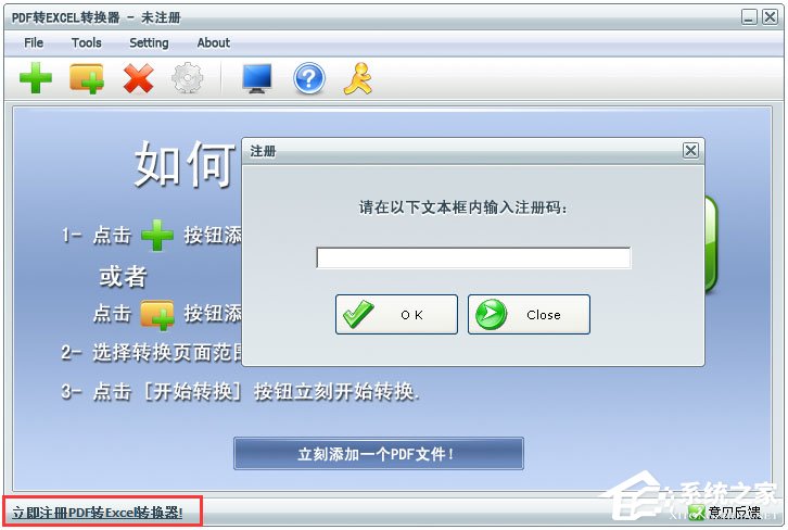 1、启动软件的时候提示当前的软件是没有激活的,你需要注册才能转换Excel;