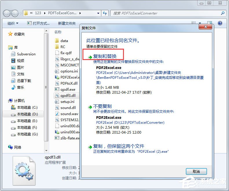 2、将软件关闭,打开补丁文件夹,复制PDF2Excel.exe到软件安装地址替换;