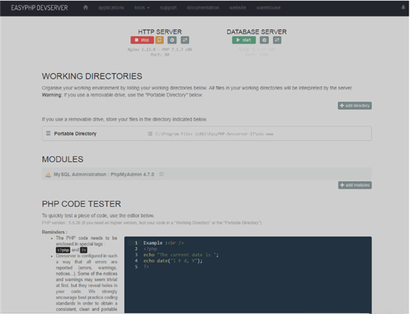 EasyPHP是在服务器端执行的脚本语言,与C语言类似,是常用的网站编程语言。主要应用于本地开发测试的环境搭建,过集成PHP、APACHE、MySQL以及各种辅助开发工具,PHP独特的语法混合了C、Java、Perl以及 PHP 自创的语法。主要适用于Web开发领域。为用户提供了一个完整的开发平台。 软件说明 这款软件是一个windows下的集成开发环境,整合了php 5.X、 apache、mysql等工具,可以免去环境配置之苦。 支持Windows 7/8/10。 软件功能本软件帮助你使用PHP管理数据、开发站点和应用程序。它是调试PHP程序的好东西,集成: PHP 5.4.6 VC9 + Apache 2.4.2 VC9 + MySQL 5.5.27 + PhpMyAdmin 3.5.2.2 + Xdebug 2.2.1 。 完整版包括PHP 7.x / 5.5.x / 5.4.x / 5.3.x, Apache, Nginx, MySQL, PhpMyAdmin, Xdebug + modules + components。 |
