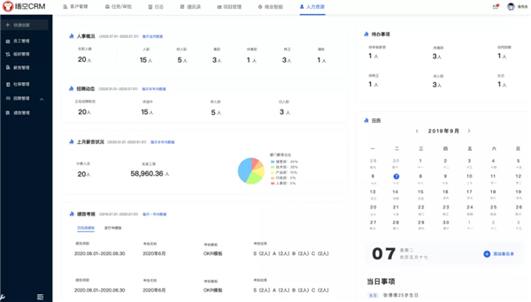在悟空CRM人力资源模块,首先您可以在工作台看到人力资源信息概况。在工作台中,可以清晰地展示企业员工的人员概况、招聘动态、待办事项以及重要的事件提醒。
