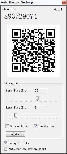 AutoPasswd,一款提供简单的密码设置功能,可以让用户在软件上设置口令,这款软件功能很简单,打开软件就可以显示一个二维码,随后可以在软件设置工作的时间长度,可以设置休息的时间长度,默认的时间单位是“秒”,可以设置电脑工作35秒后休息,可以设置电脑休息5秒继续工作。