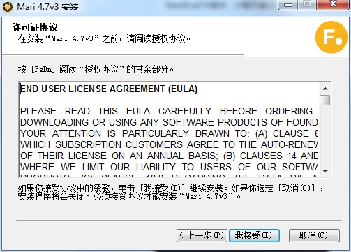2、双击Mari4.7v1-win-x86-release-64.exe运行安装,点击我接受。
