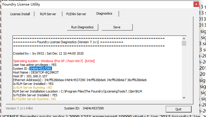 8、在开始菜单找到Foundry License Utility,右键管理身份运行,选择Diagnostics选项,然后点击Run Diagnostics按钮。