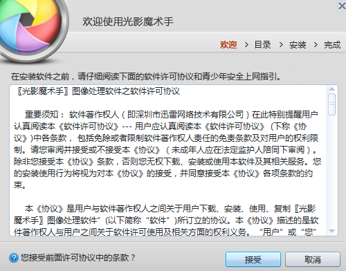 光影魔术手是一款功能强大的图片处理软件,软件拥有独有多种人像美容、照片装饰功能,搜集了近五十种一键特效,用户在这可以自由的编辑图片,自定义的设置图片参数,无论是照片美容还是修整色调,都能很快实现。是目前非常好运的图片处理工具! 功能介绍 强大的调图参数 拥有自动曝光、数码补光、白平衡、亮度对比度、饱和度、色阶、曲线、色彩平衡等一系列非常丰富的调图参数。UI界面进行全新设计,拥有更好的视觉享受,且操作更流畅,更简单易上手。无需PS,您也能调出完美的光影色彩。 丰富的数码暗房特效 拥有多种丰富的数码暗房特效,如Lomo风格、背景虚化、局部上色、褪色旧相、黑白效果、冷调泛黄等,让您轻松制作出彩的照片风格,特别是反转片效果,光影魔术手最重要的功能之一,可得到专业的胶片效果。 海量精美边框素材 各种精美的边框,轻松制作个性化相册。除了软件精选自带的边框,更可在线即刻下载论坛光影迷们自己制作的优秀边框。 随心所欲的拼图 拥有自由拼图、模板拼图和图片拼接三大模块,为您提供多种拼图模板和照片边框选择。独立的拼图大窗口,将各种美好瞬间集合,与家人和朋友分享。 便捷的文字和水印功能 文字水印可随意拖动操作。横排、竖排、发光、描边、阴影、背景等各种效果,让文字加在图像上更加出彩,更可保存为文字模板供下次使用。 图片批量处理功能 充分利用cpu的多核,快速批量处理海量图片。您可以批量调整尺寸、加文字、水印、边框等以及各种特效。 软件特色 软件特权:光影魔术手是完全免费使用的,大家在本站下载安装后可放心使用。 功能强大:人像处理、添加相框功能、任意拼图模式、添加水印和文字、制作精美日历等等。 实用性高:光影魔术手操作简单,轻松处理图片,不需要任何基础,图像处理不比PS差。 专业性强:图像批处理还拥有强大的调图参数和丰富的数码暗房特效让你轻松制作专业时尚大片。 安装步骤 1、在本站下载最新版的安装包,双击运行,推荐“安全安装”,使用更放心; 2、接受协议,开始安装; 3、完成就可以使用软件啦。 使用教程 一、启动光影魔术手软件 1、下载光影魔术手软件并安装在电脑上,确保安装成功,不会的童鞋可以查看上述安装教程。 2、安装成功后桌面会有一个它的快捷方式,双击打开运行即可。启动后我们就看到如下图了: 二、使用光影魔术手编辑图像 光影魔术手怎么抠图?光影魔术手怎么换背景色? 准备工作:准备好要换底色的图像,知道图像所存放的位置,方便一会查找与使用。 1、用光影魔术手打开一张图片。打开图片的方法是点击左侧目录区,在目录下查找自己已准备好的素材即可,如下图所示: 当然如果你喜欢使用快捷键的话,也可使用Ctrl+O键在弹出的对话框内选择我们的图片,点击“打开”也是可以的,如图所示: 这里我们以第一种方式打开,继续下面的介绍: 2、在打开的目录下找到自己的素材图片,选中它接着点击上方的“编辑图像”即可,如下图所示: 3、打开要编辑的图片会就会看到如下界面,接着我们点击偏右些的(箭头所指)的小工具,单击打开选择【抠图】→【自动抠图】。(抠图有四种模式:自动抠图、手动抠图、形状抠图、色度抠图;如果图片是和背景比较鲜明的话,选择自动抠图这样比较方便) 4、光影魔术手软件可以通过放大缩小来调整图片的尺寸,放大图像编辑更容易些。这里我们在右边有【选中笔】与【删除笔】两种画笔可供选择,这里选择【选中笔】然后将画笔移动背景中画上一笔即可,如果背景不能全部涵盖进去的话,再继续涂画没有涵盖的区域即可。其实,如果所要抠取的是一个色彩比较单一的物体的话,直接在该物体上涂画即可。(用选中笔在要选中的区域上划线,用删除避在不需要的区域上划线即可。) 5、用选中笔/删除笔划线完后,可点击替换背景点击查看自己扣的图,如果不满意还可以点击“返回抠图”继续编辑。确认抠图完成可点击在右边的背景色来选择替换,这里有各种颜色可供选择也可以调取电脑存有的图片作为背景。在下方还可以对图像进行简单的前景操作,如边缘羽化、前景透明度等。 6、光影魔术手毕竟是简单的图像处理软件没有那么专业,所以图像显得可能会比较粗糙。我们可以简单设置边缘羽化、前景透明度可使图像看起来更加好看,编辑完成可可点击“另存为”将图片保存。 光影魔术手怎么去水印? 1、打开图片,然后点击”数码暗房“——“人像”——“选择祛斑”,如下图所示: 2、选择“祛斑”后打开如下图所示,我们先对半径和力量所调整,一般画笔半径要比去除的水印要大,力量设定为130左右。设置好后用鼠标点击水印处,就能看到去除水印的效果了。(注意:为了修改更加完美建议大家点击可放大图像进行编辑,点击下方的小工具调整。还可以点击“对比”查看修改情况。) 除了以上利用”数码暗房“——“人像”——“选择祛斑”去除水印外还可以通过画笔来处理,点击画笔打开画笔工具选择矩形工具,在水印处画矩形框选,选择好后将右侧的边线选项去掉勾选,将填充颜色设置为它的边缘色即可。这样也能很简单的将图片的水印去掉,大家可自行选择。水印去除后点击确定保存就好啦。 更新日志 该版本除了在功能上更强大了以外。 素材中心又新增了字体下载。 迅雷会员可