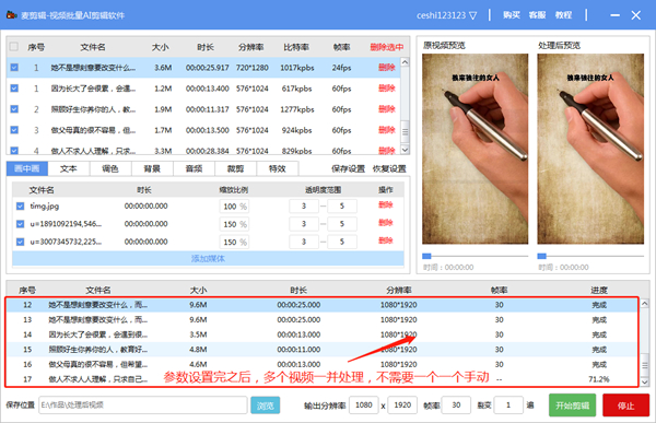 麦剪辑是一款非常好用的批量视频剪辑软件,用户可以提升视频处理的效率,设置属性完成ai剪辑的操作,还可以指定对应的输出位置与分辨率,非常实用的一款视频处理软件,需要的可以来下载试试哦。 软件功能 有效支持flv、f4v、mp4、wmv、rmvb以及其他各类常见的视频格式。 添加视频文件后可以对视频合并的顺序进行调整。 该程序支持处理不同格式视频文件。 可配置输出的格式以及其他参数,并查看视频的详细属性信息, 提供快速合并模式,从而提升合并的速度。 使用教程 1、我们首先将视频素材内容进行批量导入,然后可以在功能区中设置对应属性,处理后的视频可以在下方看到; 2、功能区中的效果都比较容易了解,例如裁剪、特效等等,背景中能够快速修改背景颜色; 3、下方还能修改保存位置及视频输出的分辨率与帧数,同时还能将其裂变; 4、设置完对应参数之后即可批量处理。 |