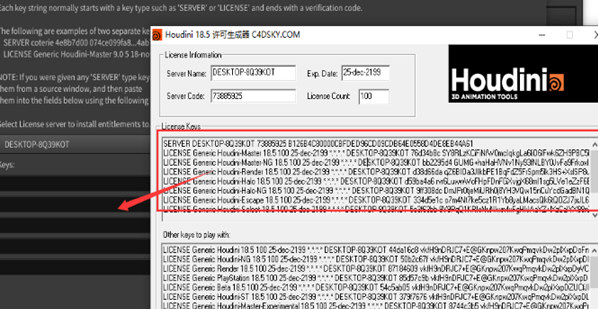 7、运行houdini18.5keygen.exe,将对应License server host和License server code,复制到注册机中,然后点击下方的generate生成按钮,你就会在两个窗口中会得到很多行注册码。
