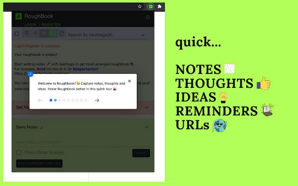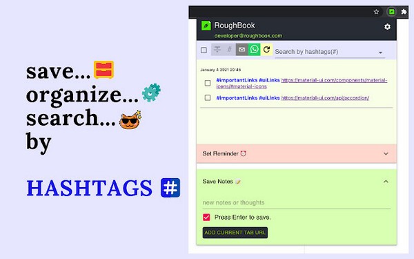 RoughBook是浏览器中的快速笔记记录插件,你可以随时在页面上记录任何信息,比如邮件内容,还可以是整张网页,同时还可以设置提醒,工作学习都能适用。通过插件你还可以将笔记分享给他人,团队协作更便捷。 软件特色 以下是RoughBook中几个有用的功能。 1、它是一个chrome扩展,因此你可以快速添加笔记。 2、增加提醒,给予通知。 3、只需点击2次即可保存当前标签页的网址。 4、给所有的笔记加上标签。 5、通过标签搜索你的笔记。 6、通过What sapp或电子邮件发送备注。 7、通过Sla ck将你的Roughbook笔记发送给你的团队。 8、要求在RoughBook中加入新功能。 9、记下未使用的注解,并在需要时隐藏/查看它们。 安装说明 1、在打开的谷歌浏览器的扩展管理器,就是点击最左侧的三个点,在弹出的菜单中选择【更多工具】——【扩展程序】或者你可以在地址栏中直接输入chrome://extensions/ 2、进入扩展程序页面后将开发者模式打勾。 3、最后将解压出来的crx文件拖入到浏览器中即可安装添加。 4、如果出现无法添加到个人目录中的情况,可以将crx文件右键,然后选择【管理员取得所有权】,再尝试重新安装。 5、安装好后即可使用。 |