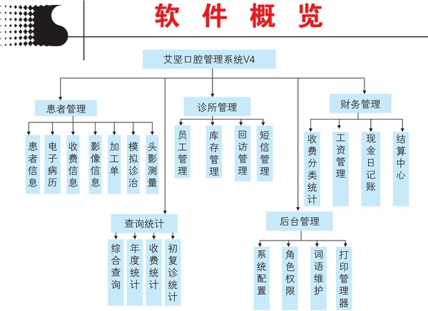 艾坚口腔管理软件是一款医院专门用于口腔管理的软件,实施真正的图形化预约,鼠标一拖一放,即可完成预约的设定,并与医生排班数据相结合,哪些时段可约,哪些时段休息,一目了然,而且根据鼠标位置智能判断,防止操作错误,还支持结算中心、工资管理、现金日记账、收费分类统计、财务日报告、收费大类统计、工作统计等工作。 软件介绍 艾坚口腔管理软件是一套非常优秀的口腔管理系统, 核心功能强大,操作流程顺畅,服务一致性好,提供从患者管理到财务管理甚至头影测量等全方位的功能。 适用于口腔门诊管理、口腔诊所管理、口腔医院、口腔科管理、牙科、齿科管理。 是国内唯一一家具有专业头影测量功能的口腔管理软件,支持多家全景机等X光诊断设备。 软件特色 患者管理 艾坚口腔管理软件官方版支持记录患者基本信息、电子病历、收费信息、影像中心、加工单、模拟诊治、头影测量。 门诊管理 员工管理、会员管理、库存管理、短信管理、预约编排、门诊日志、器械维修、消毒登记、预约排班、回访管理、加工所管理、药品管理、区域机构管理。 财务管理 结算中心、工资管理、现金日记账、收费分类统计、财务日报告、收费大类统计、工作统计。 查询统计 综合查询、年度统计、收费统计、诊疗统计、回访统计、加工单统计、供应商统计。 系统管理 词语维护、本地配置、角色权限、病历短语、收费标准、修改密码、打印管理器、数据管理器。 辅助工具 即时通、今日提醒、快速搜索、快捷提醒、收费快捷统计、帮助。 功能介绍 为了降低总体拥有成本,并满足不同业务岗位的需求,艾坚软件分成五个版本:标准版、增强版、财务版、正畸版、全功能版。 标准版 标准版包括功能:患者管理、病历管理、收费管理、打印票据、查询管理、预约管理、影像管理、加工单管理、回访管理、员工管理、短信管理、库存管理、工作提醒、统计功能、财务日报告等。可以被用作医生工作站、前台工作、 影像工作站等,也可以作为单机使用用户的管理系统。标准版性价比高,是非常实惠的版本。 增强版 在标准版的基础上,增加了治疗计划、短信自动发送、会员折扣方案、图片自动导入、患者追踪和预约排班。真正的图形化预约,鼠标一拖一放,即可完成预约的设定。并且与医生排班数据相结合,哪些时段可约,哪些时段休息,一目了然,而且根据鼠标位置智能判断,防止操作错误。 财务版 在增强版的基础上,增加了现金日记账、结算中心、工资管理、工作统计、收费分类统计,收费大类统计。尤其是结算中心,对于医生绩效工资的计算非常方便。建议财务部门采购该版软件。 正畸版 在增强版的基础上,增加了头影测量功能,预置常用的测量方法,可自定义测量方法、 测量项目、测量标志点,可以打印测量结果。建议开展口腔正畸的用户购买该版本软件。 全功能版 包括了标准版、增强版、财务版、正畸版的全部功能。 |