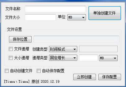 文件生成器是一款功能齐全的软件,这款软件是由网友制作的。这款软件可以让用户在指定的文件夹中自动生成文件,只需要输入文件名称,选择文件大小和生成规则就可以自动生成文件。非常方便实用,需要的可以来下载。 使用说明 1、输入要创建的文件名称例如:“data.dat”; 2、设置文件保存的地方 ,如果不设置默认程序所在的目录下; 3、设置文件是否每次创建都增长字节 【固定值】 和 【百分比】 ,第一次需要设置起始文件大小并保存设置; 4、文件命名规则有两种 【data_20201219.dat】 和 【data_1.dat】 命名相同文件会覆盖; 5、自动保存配置到配置文件; 6、自动创建文件开启后 程序运行完成会自动关闭程序(点不开的,如需点开去更改配置文件 “文件生成器.exe.config” ,点一次只会运行一次而已,不会再后台自动运行)。 更新日志 修复文件后缀名问题 支持 data.123.dat 情况。 |