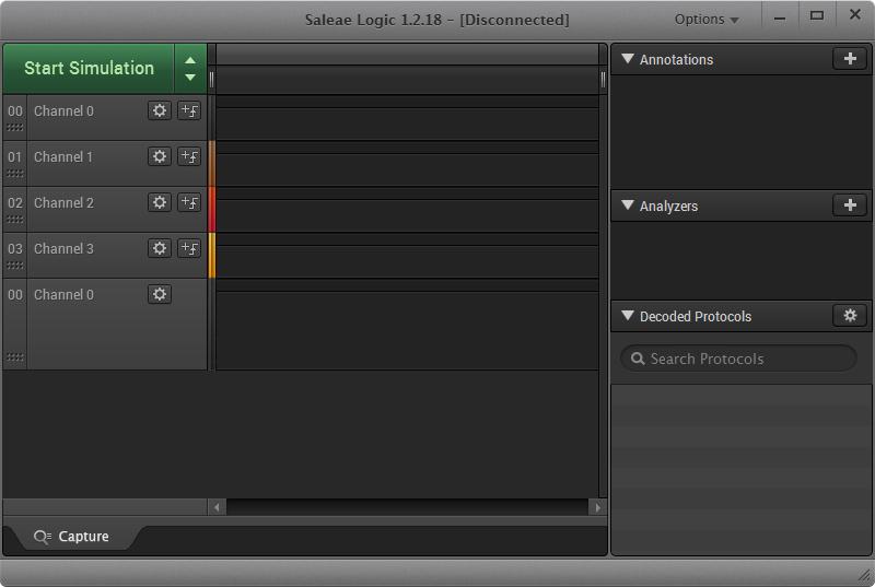 单击“开始”按钮开始记录逻辑分析仪中的数据,让软件在分析数据之前完成处理数据。 请注意,如果您没有将逻辑分析仪插入计算机,则该按钮将改为开始模拟,它将使用模拟数据并允许您在连接硬件之前学习软件。