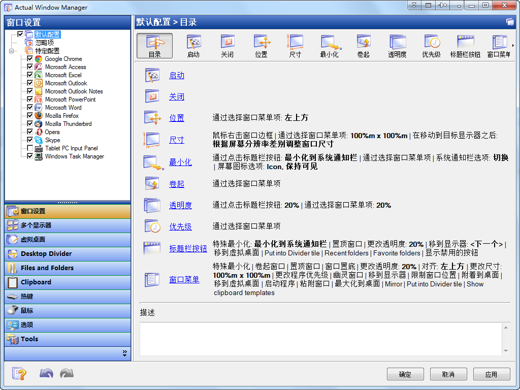 Actual Windows Manager是一个可用于管理 Windows 打开的窗口的软件。运行之后在窗口右上角的最小化、最大化、关闭按钮左面增加几个很有用的按钮,可以控制任何窗口的大小、置顶、透明度等许多 Windows 没有直接提供的设置。软件占用的内存不多,可以提高使用 Windows 的工作效率。 软件功能 1、剪贴板管理器 改进Windows剪贴板功能,具有2个附加功能:剪贴板模板和剪贴板历史记录。 2、Desktop Divider(桌面分割器) 允许您将整个大型桌面或每个显示器分割为几个不相交的区域(图块)。 3、文件夹 改进Windows文件夹导航,添加两个额外的标题按钮。 4、每个窗口的单独设置 允许您为所需的窗口,文件夹或程序设置单独的设置。 5、多个监视器 极大地改善您的多监视器环境,添加额外的全功能任务栏和其他有用的工具。 6、附加标题按钮 为每个窗口的标题栏添加附加按钮,例如最小化托盘,保持顶部,卷起等。 7、虚拟桌面 允许您在一台或多台显示器上使用无限数量的虚拟桌面。 软件特色 额外的桌面数量不限; 每个虚拟桌面是独立的全功能; 两种模式的多显示器支持:经典和独立; 实际使用窗口管理器,你将有一个全功能的任务栏每个监视器和许多其他功能,以提高多显示器的桌面环境; 全功能任务栏上为每个显示; 桌面背景和屏幕保护程序管理; 额外的鼠标功能多显示器管理; 桌面配置文件; 改进的Windows文件夹导航; 实际窗口管理器允许使用两个附加的标题按钮的每个窗口。这些特殊的按钮改进Windows文件夹导航,所以你不必使用长操纵鼠标,通过跟踪到所需的文件夹; 最近的文件夹; 收藏夹; 为您提供了许多额外的标题按钮与实际窗口管理器; 最小化到系统托盘; 移动到下一个显示器; 总在最前; 调整窗口大小; 单独配置每个窗口; 配置您的操作系统,如你所愿。实际窗口管理器,你可以单独设置许多参数,每个窗口; 设置启动方式和位置; 设置窗口的优先级; 忽略停用。 更新日志 [!] Windows 10:在某些情况下,当实际窗口管理器设置为在系统启动时加载时,任务视图窗口可能会中断。 [+]桌面分割器:添加此功能以创建自定义放入分隔器平铺热键操作,鼠标操作和标题按钮操作。 [+]组合动作:添加该功能以将Put into Divider Tile动作插入到组合序列中。 [*]选项卡资源管理器,Windows 10内幕预览:选项卡式容器窗口现在支持Dark视觉主题。 [*]按应用程序音频设备切换器:Sonic Suite 3和Nahimic 2音频软件改进了兼容性。 [*]热键:自定义“启动程序”热键现在可以忽略当前活动的窗口。 [*] Windows 7+:显示使用不同用户凭据启动的应用程序的通知区域图标(例如,任务管理器,Skype)。 [*]配置:现在所有的工具栏都遵循“选项 - 用户界面”面板中“工具栏”组的选项。 [ - ]多监视器任务切换器在Windows 10之前停止在所有系统中工作。 [ - ]实际任务栏:MS Teams应用程序按钮在使用自己的方式将窗口最小化为通知区域图标后仍保留在任务栏中。 [ - ]实际任务栏,Windows 10:AVG和Avast等程序的通知区域图标的气球通知不断弹出,无法关闭。 [ - ]实际任务栏:在极少数情况下,辅助任务栏中的通知区域可能保持为空。 [ - ]实际任务栏:有时,在恢复最小化窗口后,如果启用了最小化/恢复的动画效果,则其按钮可能会从任务栏中消失。 [ - ]实际任务栏,Windows 7+:单击“显示桌面”按钮后,Aero Peek效果保持活动状态,直到鼠标指针移到按钮外部。 [ - ] Windows 10,窗口设置:特定设置不适用于全屏运行的UWP应用程序(例如Groove,Solitaire Collection)。 [ - ] Windows 10,实际任务栏:任务按钮未显示为全屏运行的UWP应用程序。 [ - ] Windows 10,标题按钮:将UWP应用程序从全屏切换到窗口后,额外的按钮没有显示在标题栏中。 [ - ] Windows 10,快速设置:无法通过单击其标题栏为UWP应用程序窗口调用“快速设置”对话框。 [ - ]窗口设置:将“在窗口启动 - 锁定鼠标”操作应用到窗口然后关闭它后,鼠标仍然锁定在关闭窗口的矩形内。 [ - ]配置:“全局选项 - 启动程序”面板在以前的版本中意外破坏。 |