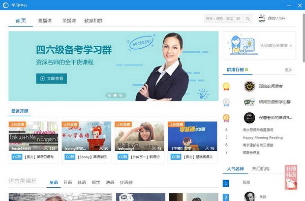 CCTalk电脑版是一款沪江网旗下的互动教育直播软件,互动直播课堂就是为了创造一个可以聊天交流的环境,这样才有助于学习外语,让学生和老师们沟通更加顺畅,老师准备课程并通过软件进行直播,学生在平台上寻找自己感兴趣的课程进行学习,线上教育是未来大趋势,希望这软件也能够帮到你。 软件特色 1、课程丰富,总有你所需; 2、全天实时直播,互动最重要; 3、专业口语,外教交流无国界; 4、免费课程,应有尽有; 5、绿色产品体验,学习氛围更浓厚。 软件功能 1、课上能力 双向白板 课堂白板如同线下的黑板,让老师在直播的过程中循序渐进地深入或提高或补充课程内容,随时插入自己的板书、注释,对上课的讲解内容起到完美的补充。双向白板的使用让老师和学生通过电脑屏幕就能完成无障碍学习。 多人视频 多人视频保障了网师和学生的音视频同步沟通,保证了在课堂中多对多的学习效果。 答题卡 老师在直播的过程中可以随机灵活出题,通过答题卡功能让学生进行解答。充分激发学习者的学习兴趣和热情,达到学以致用的效果。 举手上麦 当有学生举手,老师可以选择学生发言,老师也可以提问,让学生举手回答,模仿现实课堂中的举手场景。增加老师与学生之间的实时互动,将线下课堂无损地迁移到线上直播中来,实现了网师和学生的双向互动。 幻灯片播放 网师通过课前准备,将上课大纲通过幻灯片的方式进行备课,帮助学生课上更好的理解上课内容。 2、课后能力 课程录制 录制老师上课时的课件、摄像头、屏幕分享等所有直播内容,如果用户错过直播,也可以看到录播课程,不会耽误学习。 布置作业 网师在课后通过,一键布置作业,连接至的沪江社团,帮助学生巩固课上知识。此功能打通了CCtalk和沪江社团的连接。 班级群互动 网师和学生通过班级群互动,不但保障了课上的沟通,还在课下延续了双方的交流,共同打造学习型社区。 3、运营能力 课程推荐 网师在发布课程之后,通过CCtalk的大数据功能,把最新课程推送至发现页和关注网师的粉丝们。 上课提醒 每位预定课程的用户在课前都可以收到上课提醒,避免错过开课时间。 订单记录 订单记录让课程的收费金额一目了然,区别普通购买和优惠券购买,让网师们玩转营销,轻松收款! 直播人数分析 网师在后台可以看到课程直播参与的人数走势,了解学生喜爱收听的部分,帮助网师不断优化后续课程! |