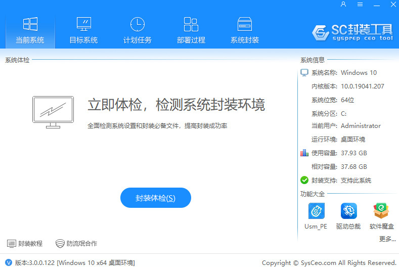 SC封装工具是一款面对Windows操作系统封装的强大工具,软件界面便捷,操作起来简单易用,使用这款SC封装工具是学习研究系统封装爱好者的首选,马上下载体验吧。 软件功能 1、三种封装模式,传统封装模式,防流氓封装模式,大客户封装模式; 2、智能检测和修复封装环境及系统设置提高封装成功率; 3、目标系统自动同步系统封装前的各种设置; 4、多元化部署模块并可自定义模块功能; 5、支持调用外置设备的程序,移动设备或光盘,任意盘符的功能; 6、内置丰富全面的磁盘控制器驱动; 7、延续SC2.0的各种优点功能,简单易用,一步到位; 8、无绑定推广,无广告。 软件亮点 1、防流氓封装模式为你的收益保驾护航; 2、可禁止虚拟机里部署防止恶意刷联盟推广包; 3、SC3.0部分功能没有做选项展示,默认自动处理了,比如输入法自动保存,固定到任务栏的图标自动同步等等; 4、SC3.0计划任务新增对MSI格式的支持; 5、修复SC2.0的已知Bug,支持Windows10部署背景图的自定义; 6、SC3.0新增同步封装前的IE主页,收藏夹数据的功能。 |