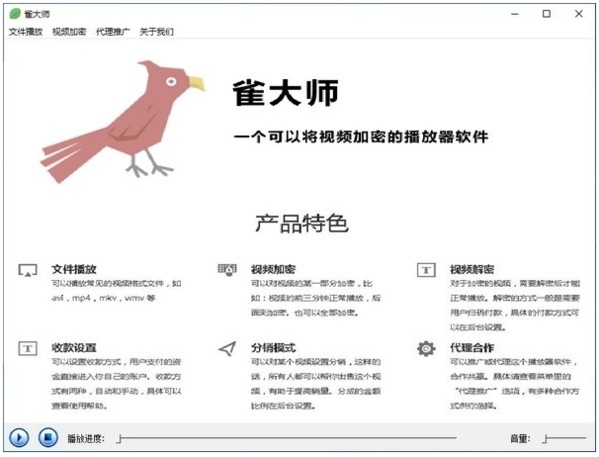 雀大师官方安装版是一款优秀的视频播放软件,雀大师不仅能够将所播放的视频进行加密,而且支持多种不同的视频格式,能满足用户对于视频播放的需求,使用起来也非常方便,有需要的朋友就来下载吧。 软件特点 文件播放 雀大师播放器是免费的。可以正常播放常见的视频格式文件,如avi,mp4,mkv,wmv等。 视频加密 可以对本地的视频文件进行加密。可以加密某一部分,比如:视频的前三分钟正常播放,后面则加密。也可以全部加密。 视频解密 对于加密的视频文件,需要解密后才能正常播放。解密的方式一般是需要用户扫码付款,具体的付款方式可以在后台设置。 收款设置 可以设置收款方式,用户支付的资金直接进入你自己的账户。收款方式有两种,自动和手动,具体可以查看使用帮助。 分销模式 可以对某个视频设置分销,这样的话,所有人都可以帮你出售这个视频,有助于提高销量。分成的金额比例在后台设置。 代理合作 可以推广或代理这个播放器软件,合作共赢。具体请查看菜单里的“代理推广”选项,有多种合作方式供你选择。 |