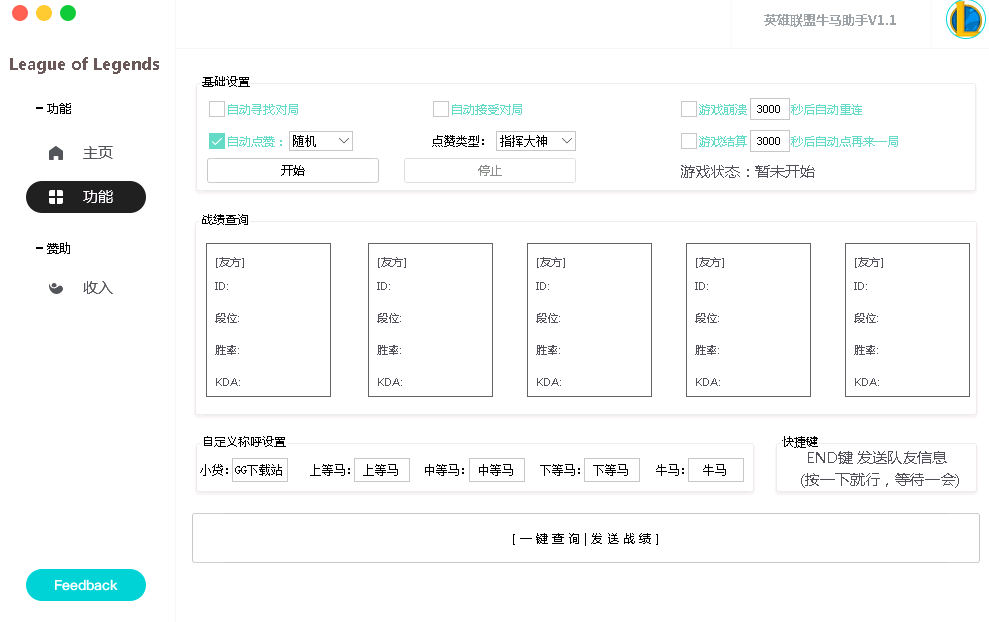 LOL牛马助手是一款基于英雄联盟客户端开发的功能软件,此软件提供发送队友战绩、查询段位/胜率、KDA等功能,方便快速的发现谁是菜鸟还是大神,全面了解对手信息,感兴趣的用户快来下载。 软件功能 1、支持自动寻找对局以及自动点赞。 2、支持自动接受对局以及点赞类型的设定。 3、支持游戏崩溃多少秒后自动进行重连。 4、支持游戏结算多少秒之后自动点再来一局。 5、开局选人阶段就可以一键发送全部队友的战绩信息,包括段位、胜率以及KAD等等信息,快速定位上等马与下等马玩家。 软件特色 1、通过键盘end键就可以直接在对局房间内发送队友战绩,轻松查询你的牛马队友。 2、一键式查询发送,而且可以查看十分全面的查看队友游戏相关信息。 3、软件是基于LCUAPI开发而成的,所以使用完全无任何的风险。 更新日志 1、修复了OPGG改版而导致的天赋数据不可以正常显示的问题。 2、对天赋系统进行了修复。 |