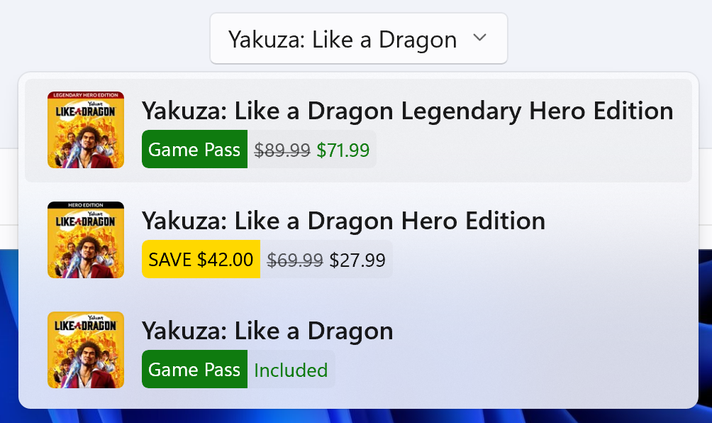 Microsoft Store 中不同游戏版本之间的比较。