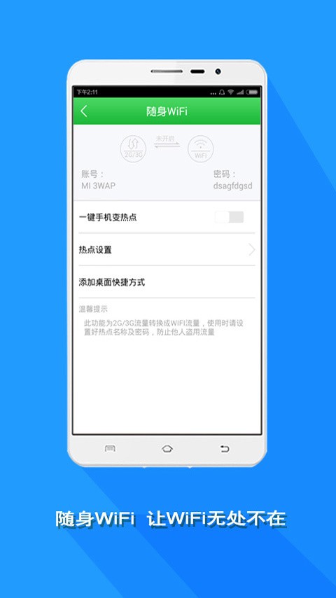 1.用户可以查询他们以前的测试历史 2.实时数据保存便于您比较测试结果 3.我们的产品从公共场所收集有用的WiFi密码。为了方便用户查看WiFi密码, 4、一键连接,海量wifi热点一键连接 5.方便]点击一个按钮查询,几秒钟就能找到免费Wi-Fi热点,一个按钮就能安全连接,操作简单,上网就这么简单。内置中国移动、中国联通、中国联通、中国电信中国网等运营商热点,连接安全、便捷 WiFi密码小编点评