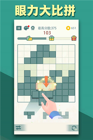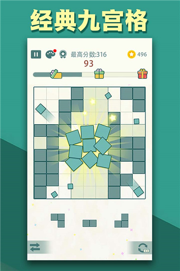 方块九宫格是一款非常有趣的休闲益智游戏。这个游戏类似于小时候玩俄罗斯方块。可以通过随机投放不同的形状,与现有的块形成一个完整的块来消除。这款游戏的不同之处在于界面是绿色的,清新简约,不是垂直的黑色界面。而且还有三组掉落的方块,可以用手指放置。除了在水平和垂直行中组成完整的正方形,您还可以组成九个正方形来消除正方形。淘汰越多,分数越高。如果游戏平面满是方块,那么游戏就结束了,这个局的分数会显示在界面上。此外,游戏界面还会显示玩家历史最高分。想要超越自己的最高纪录,就需要玩家动动小脑筋!这样一款轻松的益智游戏,绝对会让你在下班无聊的时候成为一个不错的选择!欢迎来到这个网站下载修改版的方块九宫格并体验它! 游戏攻略 1.放置在棋盘上的方块不会移动,当棋盘下方的方块放不下时,游戏结束; 2.玩方块九宫格游戏时,注意不要把棋盘填得太满,否则你将无法放下大积木,导致游戏结束; 3.别担心!没有时间限制,行动前可以考虑清楚; 4.拖动棋盘下方的方块放入棋盘中,使不同形状的方块可以填满棋盘中任意九个方块; 5.每次填充一个九平方的正方形,或者填充棋盘的任意一个横竖行,都可以消除一次; 6.当区块同时满足多个淘汰时,可以获得更高的淘汰分数; 游戏亮点 1.方块九宫格游戏中很酷的游戏界面,不同形状的方块,把方块拖进棋盘。 2.让不同形状的方块填满棋盘中任意九个方块或行列,消除分数。 3.如何在棋盘中填充更多的方块是游戏的关键!一旦放在棋盘上,方块就不能移动。 4.如何合理的放置方块来获得更多的淘汰分数,需要你保持聪明的头脑和清晰的思维。 游戏特色 1.极简UI,五颜六色的方块:没有任何多余的按钮,游戏界面极其简洁清爽,各种形状的方块五颜六色,绝对会第一时间吸引你的注意力。 2.没有WIFI?没问题:单机休闲游戏,无论你在哪里,有没有互联网,都可以玩快乐游戏,随时随地给你带来快乐。 3、智能大脑,炫酷消杀:经典的拼图游戏,将方块拖进棋盘进行拼接和消杀,消杀特效华丽又炫酷,并且闪你的眼睛。 4.规则简单易掌握:拖动方块的简单操作就可以消除方块,规则清晰易懂,大大小小的朋友都可以轻松玩。 5.创新有趣,爱不释手:在传统玩法的基础上注入新元素,体验经典玩法的畅快淘汰,带来全新刺激有趣的体验。 游戏优势 1.它不是浓墨重彩的厚砖,而是清新简约的九格拼图; 2、采用清新简约的蓝绿配色保护眼睛,缓解压力,非常适合喜欢益智休闲方块游戏的你; 3.将方块拖到棋盘中,使不同形状的方块可以填满棋盘中任意九个方块或行列,消除分数; 4.如何合理放置方块,获得更多的淘汰分数,需要保持聪明的头脑和清晰的思维。来试一试。 |