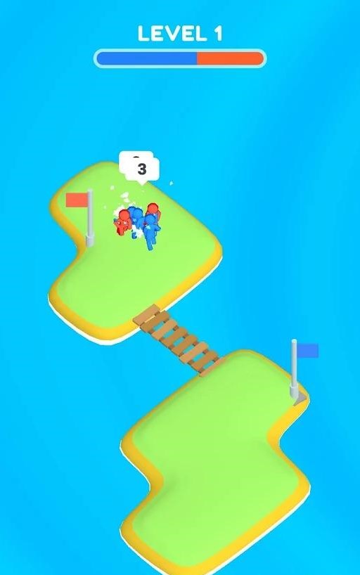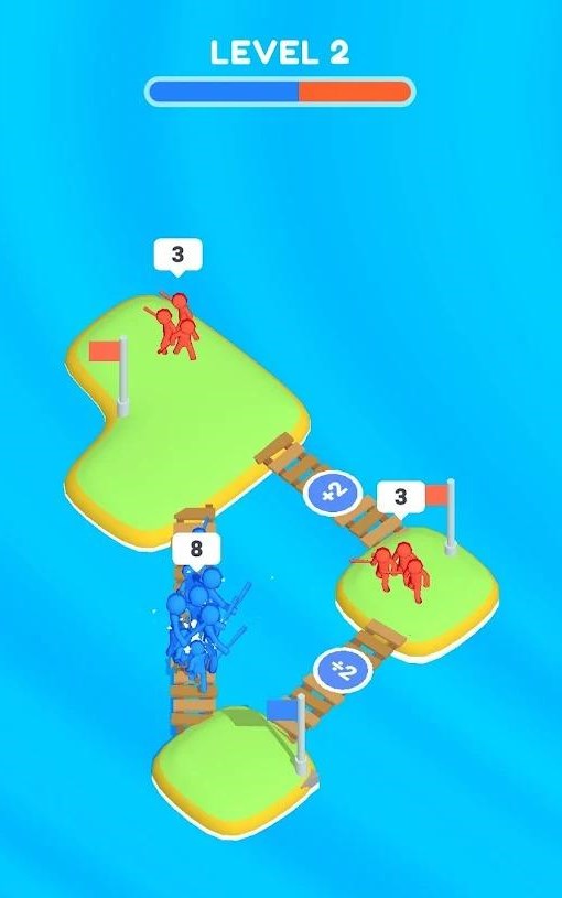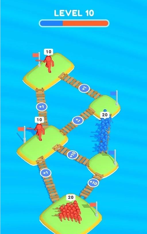 Mighty Islands游戏特点:1、你将指挥蓝色小人通过不同数量关系的桥梁,以增加蓝色小人的数量; 2、当到达红色小人的岛上时,就会发动战争,谁的人数多谁就会赢得最后的胜利; 3、也就是说你需要让蓝色小人的数量多于红色小人,你就可以赢得胜利,并占领红色小人的岛屿。