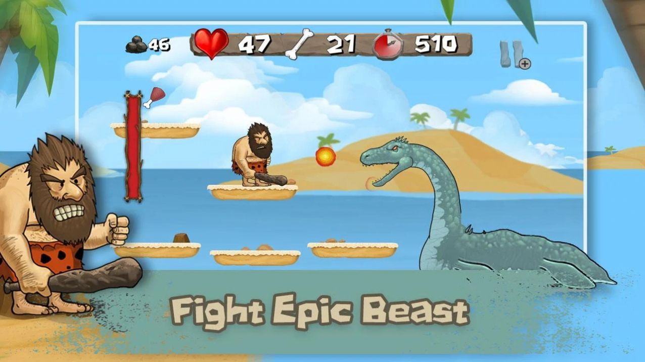 原始人冒险岛游戏是一款充满乐趣的指尖原始人战斗冒险游戏。经典的横版动作冒险闯关玩法设定,进入到地图之中我们要运用最为灵活的操控手段去解决你所遇到的敌人,你的原始人血量是有限的,不要被那些原始生物攻击到更多次数,这样才能顺利的抵达各个关卡终点。