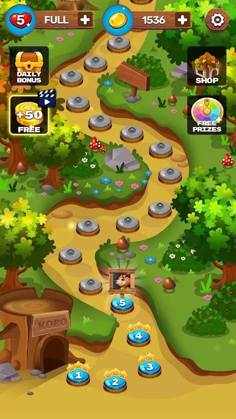 Kobo Forest Sweets游戏亮点:1、每天查看一下,旋转“每日助力轮”即可获得免费奖励; 2、参加限时挑战,获得助推器,以帮助您升级; 3、独自参加这个史诗般的传奇,或与您的朋友一起玩,看看谁能获得最高分。