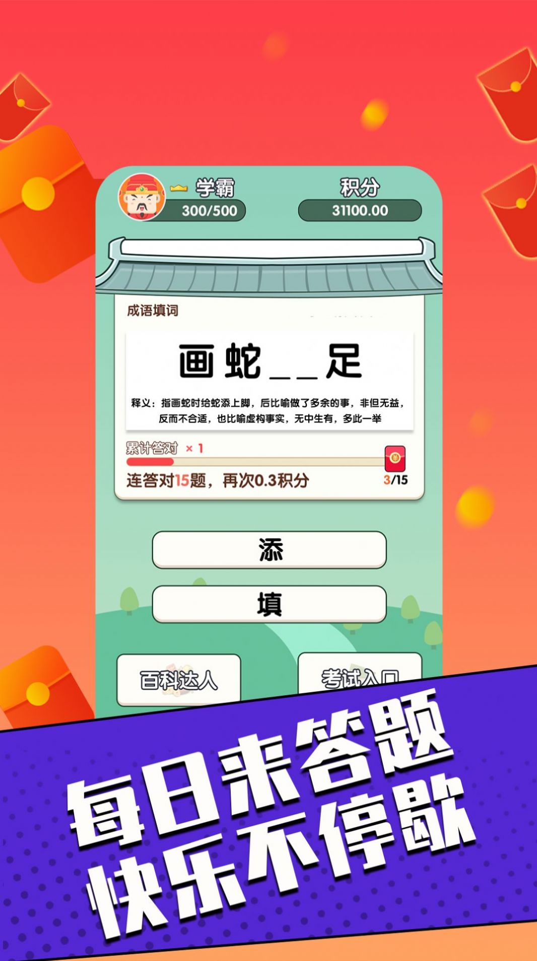 答了么红包版是一款非常不错的答题闯关游戏。快来这里测试你的知识储备吧,涵盖各个不同领域的问题,根据给出的选项进行作答,整体难度不会很高,但是趣味性十足奖励多多,只要坚持每天答题可以收获的奖励是非常不错的,没有任何的门槛,所有玩家都能够参与其中享受更加精彩的冒险。