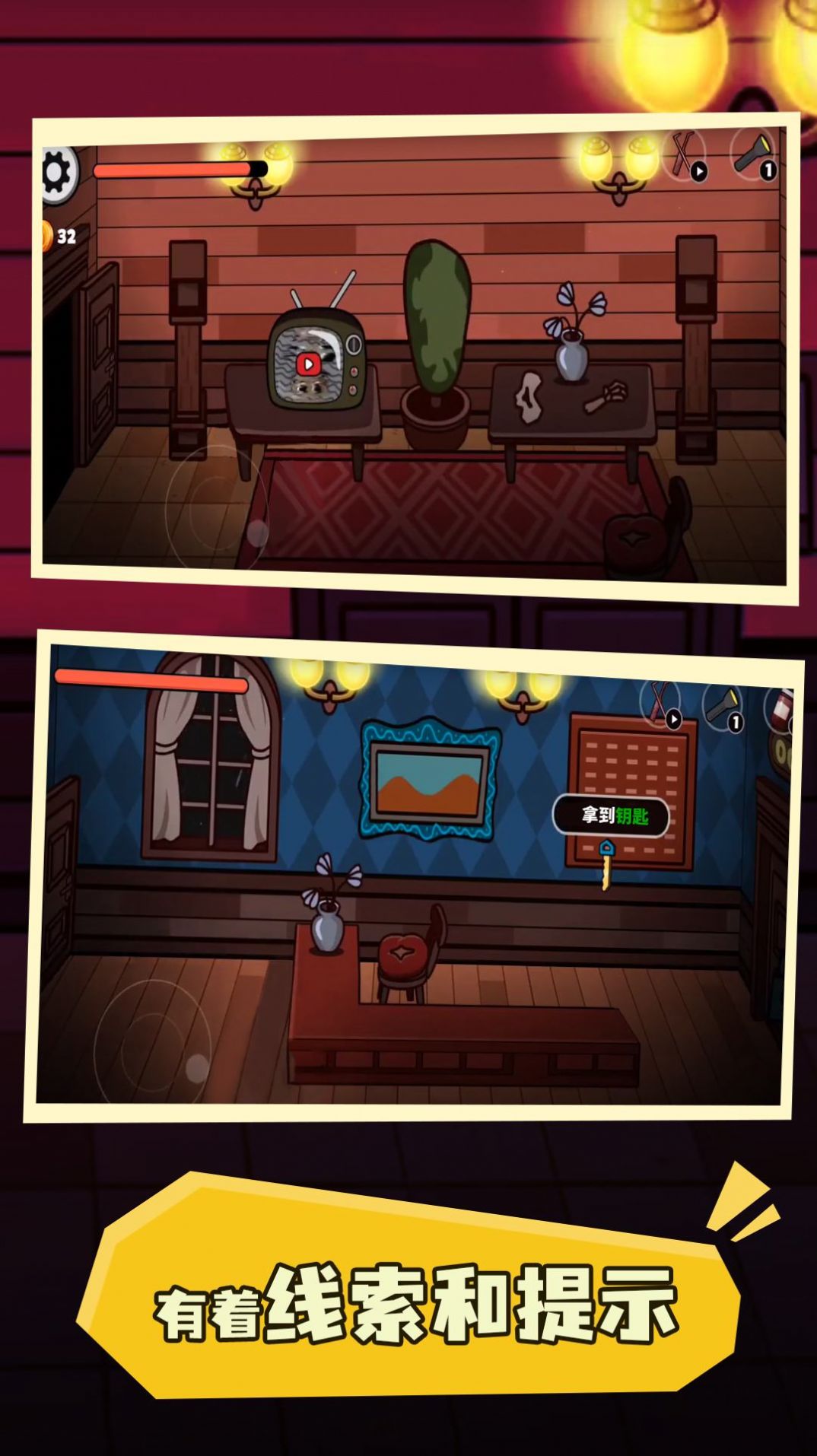 游戏特色:1、拥有扣人心弦的剧情,采用引人入胜的故事情节。 2、带给你紧张刺激的解谜体验,体验挑战智力的乐趣。 3、展现了密室逃脱的紧迫感,让你亲身体验生死一线的刺激。