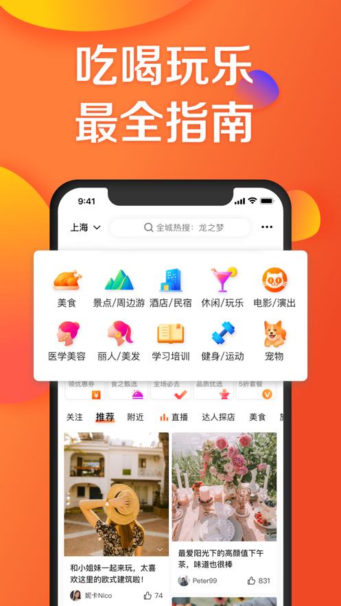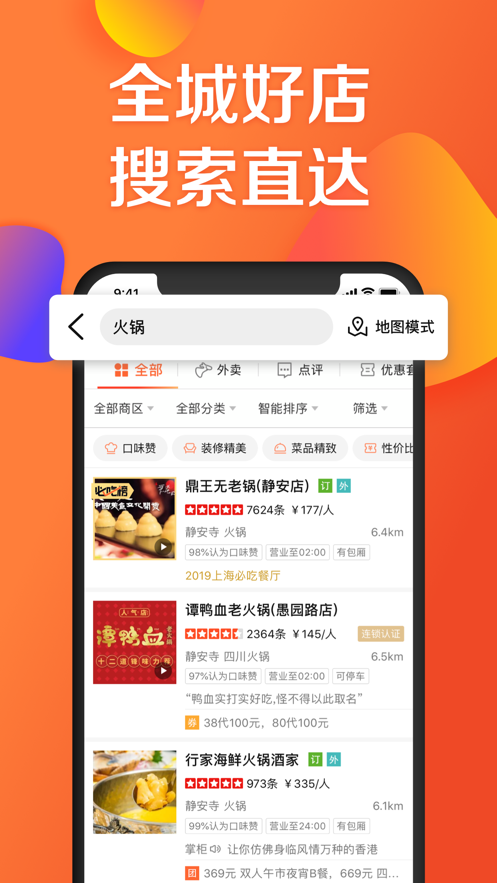 大众点评网app下载手机版特点:1、吃喝玩乐全覆盖,美食优惠、好店推荐、外卖订餐、酒店门票、旅游攻略、电影票预定、团购信息应有尽有! 2、除此之外,还提供各类本地生活服务,如休闲娱乐KTV、亲子、美发、医学美容、结婚摄影、健身运动等; 3、贴心周到的上门服务包括,"家庭保洁、保姆陪护、家电维修、搬家、宠物"等等。