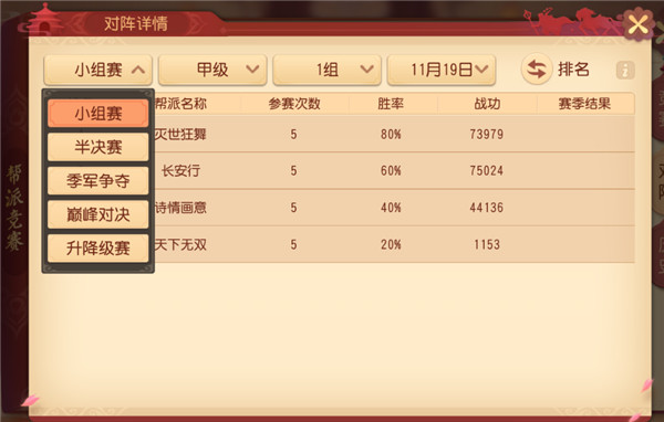 5、小组赛结束后,甲乙丙级各小组的最后一名与丁级各组的第一名进行升降级名额争夺比赛,升降级比赛的结果将决定下一赛季帮派所在的竞赛档次