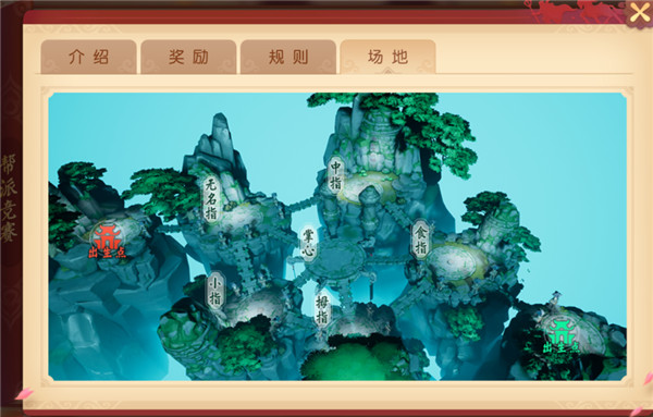 帮派竞赛五个台的对战是需要战前帮派领导人物应当提前分配好人的,然后单场战场里,要注意场内地图是上路中指平台没有桥连向掌心平台,而中路下路的平台都是有桥相互连通的。