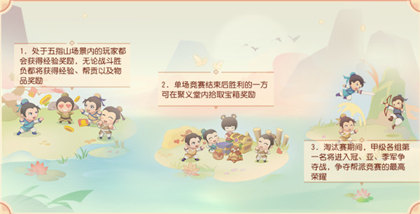 1、单场竞赛结束后,胜利的一方可在聚义堂内拾取宝箱奖励,且无论战斗胜负,参加竞赛在玩法场景内的玩家都会获得经验、帮贡以及有几率获得物品。