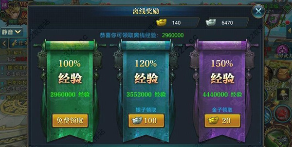 不在线的时间久了就可以获取离线经验奖励,可以免费领取100%离线经验,也可以选择100银子领取120%的离线经验,或者20金子领取150%的经验,要是挂机的时间较长,推荐选择用金子领取