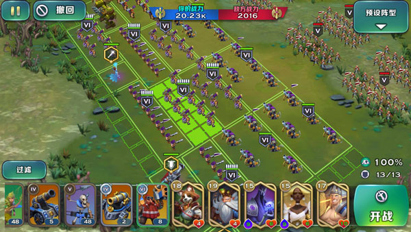 玩家可以对各个兵种进行合理细致的派兵布阵操作和席位细微调整。不同兵种所占的占地面积不同,排列的前后顺序也根据自身特点有所考究。