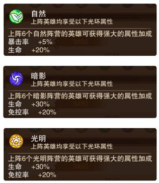 以下是纯色单阵营的光环效果,能看出各个种族的光环加成效果都很高,尤其是暗影和光明种族。不过小编这里不推荐新手玩家前期使用单阵营,因为前期获取英雄的数量有限,培养同阵营的6个英雄需要大量同一个种族的英雄材料,会比较缺狗粮。