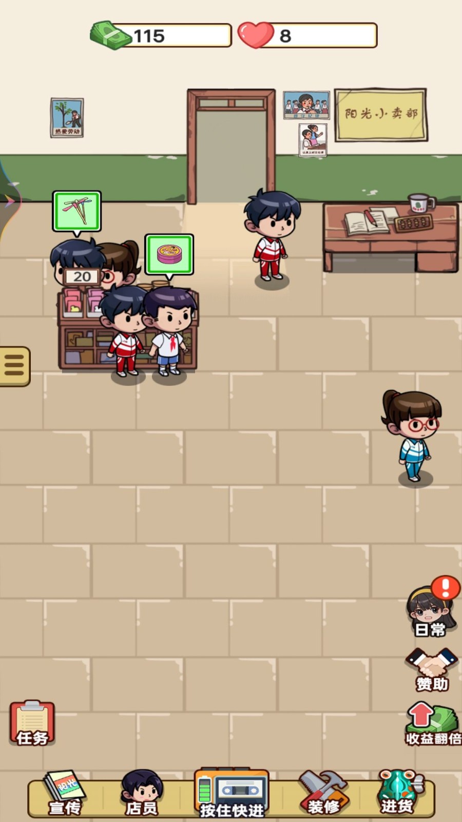 老爹的小卖部游戏安卓版是一款以休闲治愈风格的卡通模拟经营游戏。在这个游戏中,玩家将扮演一家小卖部的老板,在学校附近经营自己的店铺。通过销售各种商品,满足学生和家长的需求,创造一个充满爱心和创意的小卖部。 游戏特色: 1、丰富的卡通玩法:《老爹的小卖部安卓版》中,玩家可以体验各种有趣的卡通玩法。购买货架可以展示更多的商品,吸引顾客的兴趣。根据顾客的购买记录和喜好,可以提供个性化的促销活动,增加顾客的购买欲望。让你的小卖部成为众多学生和家长的热门去处。 2、有趣的任务挑战:游戏中充满了各种有趣的任务等待玩家去完成。通过完成这些任务,可以获得丰厚的奖励,进一步壮大自己的小卖部。这些任务的类型多样化,让玩家在游戏中保持新鲜感和挑战感,让你无时无刻都感到兴奋不已。 3、经营文具店的乐趣:玩家可以亲身体验经营文具店的乐趣。需要合理运用商业头脑和经营策略来应对各种挑战。购买更高级的商业设备,如POS机和收银台,可以提升店铺的服务水平和效率。让你的小卖部成为一个高效、便利且受欢迎的地方。 4、多样化的促销策略:为了吸引更多的顾客,玩家可以灵活运用各种促销策略。不论是打折优惠还是买一送一,只要善于运用,就能吸引更多的顾客光顾你的店铺。提供个性化的促销活动也可以增加顾客的购买意愿。让你的小卖部不仅成为生意兴隆的地方,更是顾客爱恋的去处。 5、轻松有趣的玩法:《老爹的小卖部安卓版》采用了轻松有趣的玩法,适合各种不同类型的人玩。游戏界面简洁明了,操作简单易懂,让玩家可以轻松享受经营小卖部的乐趣。无论你是喜欢模拟经营还是纯粹娱乐放松,这款游戏都能满足你的需求。 |