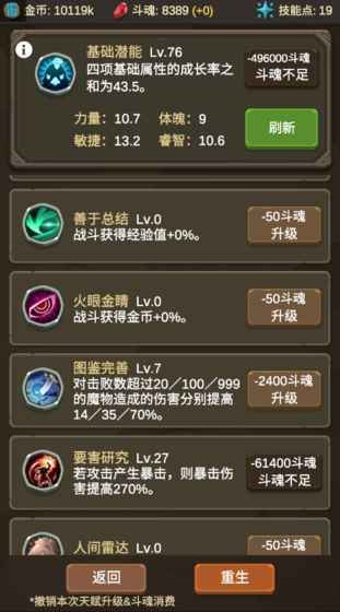 魔物调查者无限金币版中文最新版是一款由株式会社MokaGames制作的放置冒险类型的RPG手游。在这个游戏中,玩家可以控制自己的角色不断前进并与各种敌人战斗,解锁各种技能和装备,提升自己的战斗力,打败更多的敌人,闯过更多的关卡。 游戏特色: 1、打破最强配点和战术的传统思维:魔物调查者无限金币版中文最新版在角色成长阶段和不同关卡中,都有克制和被克制的战术,无法一套配点打遍天下。玩家的观察和思考将决定角色是越级打怪还是被怪摩擦。 2、硬核的角色培养:游戏没有职业设定和职业限制,玩家可以自由培养主角。接近200个结点的技能树让玩家随心所欲地培养主角,以对抗各种魔物。玩家可以发挥创意,创造独一无二的技能流派。 3、自由的重生系统:当战斗遇到瓶颈时,玩家可以随时进行重生,将主角打回1级并重新构筑技能配点路线。虽然等级倒退,但会获得斗魂以提升主角的天赋潜力,让主角具备更大的成长空间。 4、休闲养肝的放置RPG:魔物调查者无限金币版中文最新版具备玩法策略深度,同时又是一款休闲放置RPG游戏。玩家不需要天天打怪,只需要思考战术的搭配,不会游戏氪金,让整个游戏非常轻松。 5、百种玩法随心所欲:游戏提供了丰富的玩法,让玩家可以随心所欲地探索整片大陆。游戏中还有独具策略的深度元素,能够提升主角的天赋魅力。 总结:魔物调查者无限金币版中文最新版是一款融合了放置和冒险的RPG手游,它的游戏特色包括角色成长的战术多样性、自由的重生系统、硬核的角色培养、休闲养肝的放置玩法以及百种玩法随心所欲。如果你喜欢考虑战术,培养角色,并享受休闲和放置游戏的乐趣,那么魔物调查者无限金币版中文最新版将是你的不二选择。 |