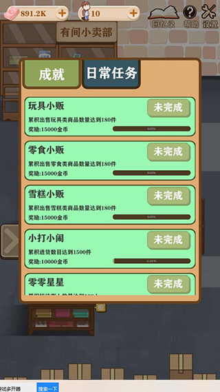 有间小卖部是一款非常有趣的模拟经营小游戏,让玩家可以在游戏中体验到经营小卖部的乐趣和挑战。游戏的玩法简单休闲,没有复杂的操作;画面精美细腻;真实的经营体验;社交互动;不断更新的内容等优点都让这款游戏成为了一个不容错过的休闲游戏。 游戏特色: 1、 多样化的商品:游戏中的商品种类非常丰富,包括零食、玩具、爆米花等等满足不同顾客的需求。 2、 及时的货品补给:为了满足顾客的需求,玩家需要及时对一些空缺的货品进行补给。 3、 时下热卖品的掌握:了解时下热卖品是什么是非常重要的,这可以帮助玩家更好地进购商品提高店铺的销售额。 4、 宣传和提升人气:玩家需要通过派发传单等方式来宣传自己的店铺提升店铺的人气。 5、 简单的操作:玩法简单休闲,没有复杂的操作,玩家只需要通过点击屏幕来完成进货、销售等操作。 游戏亮点: 1、 丰富的任务和成就:游戏准备了日常任务和成就,不断地挑战自己,完成任务和成就就能得到金币奖励。 2、 精美的画面:游画面精美细腻,色彩鲜艳感受到小卖部的温馨和可爱,角色形象也十分可爱,让人爱不释手。 3、 真实的经营体验:经营体验非常真实,玩家需要考虑到店铺的选址、装修、价格等因素,才能更好地吸引顾客和提高销售额。 4、 社交互动:支持社交互动,邀请自己的朋友一起经营小卖部,共同完成任务和挑战。 |