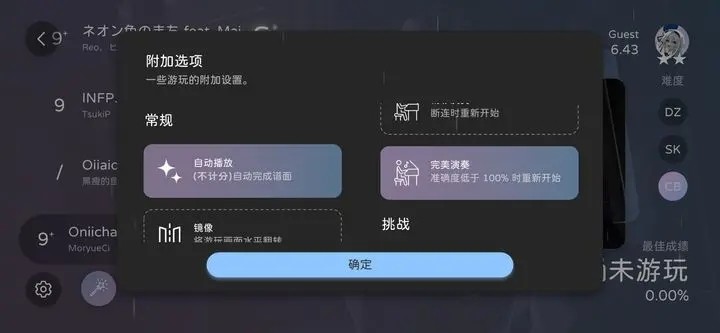 游玩设置模块可以调整流速,音符大小以及重试方式,此外还有指示器和多押提示选项。玩家可以多次调整流速和音符大小来找到自己心仪的配置。