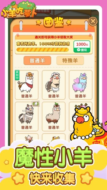 小羊吃萝卜官方正式版一款非常精彩的手机模拟点击游戏。在这款游戏中,玩家将挑战各种不同难度的关卡,冒险游戏内拥有非常丰富的小羊,并且还有多种炫酷的精美服装可以自由搭配。玩家需要帮助小羊顺利吃到美味的萝卜,并完成各种挑战。 游戏特色: 1、丰富多样的游戏选择,满足不同用户的游戏需求。无论你是想要放松一下还是挑战自己的技巧,这款游戏都能满足你的需求。 2、很适合闲暇之余下载下来玩玩,游戏操作简单,只需要将小羊移动到相应的位置就能成功过关。即使是小朋友也可以轻松上手,而且能够培养策略和反应能力。 3、通关条件很清晰,玩家需要将场景内的所有小羊全部清除才能过关。挑战自己的逻辑技能,帮助你体验最快速的完美停车玩法。 4、超多的关卡等你去挑战,每个关卡都有不同的难度,而且过关后还能获得红包奖励。不仅能够享受游戏的乐趣,还能获得实际的奖励。 5、游戏商城中还有各种道具,这些道具能够帮助你轻松的消除小羊,并且道具种类繁多,让你能够感受到更多的乐趣。 游戏亮点: 1、畅玩这个停车风格的休闲小羊闯关游戏,游戏内容超级解压,给你更多红包福利。让你在游戏中放松心情,享受玩游戏的乐趣。 2、游戏玩法虽然简单,但是挑战性还是不容小觑的。玩家需要完成各种任务,只要完成任务就能够免费领取红包奖励。 3、游戏优势很明显,不仅可以培养玩家的策略和反应能力,还能够获得丰厚的奖励。不管是对于职场人士还是学生党,都是一种很好的放松方式。 4、游戏操作简单,但是需要玩家有一定的洞察力和思考能力。通过挑战各种不同难度的关卡,让你不断提升自己的能力。 5、游戏内有丰富多样的小羊和服装可以选择,每个小羊都有自己的特色。玩家可以根据自己的喜好进行搭配,打造独一无二的小羊形象。 总结: 小羊吃萝卜官方正式版是一款非常精彩的手机模拟点击游戏,拥有丰富多样的游戏选择和炫酷的服装搭配。游戏特色独特,玩法简单有趣,挑战性十足。通过游戏的挑战和闯关,能够培养玩家的洞察力和思考能力。同时,游戏还有丰富的奖励和福利,让玩家在放松娱乐的同时,还能够获得实际的红包奖励。快来下载试试吧,体验这款精彩的小羊吃萝卜游戏吧! |