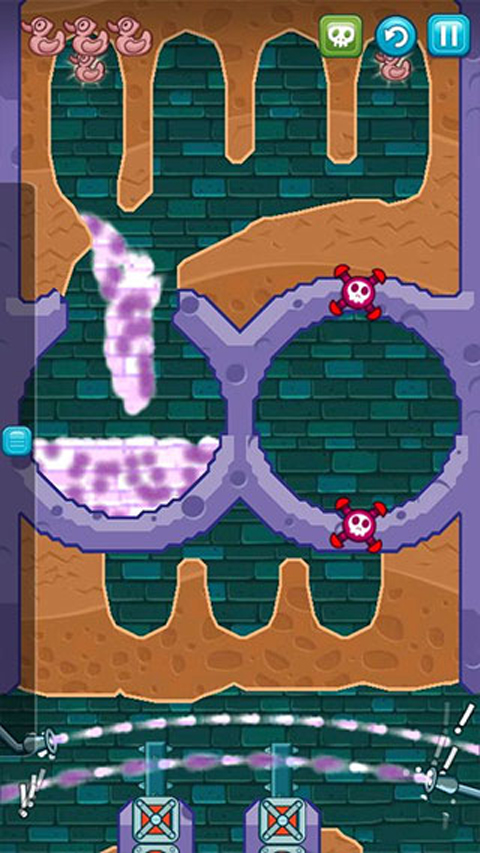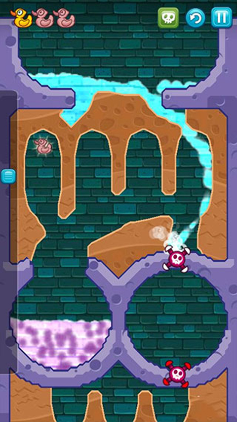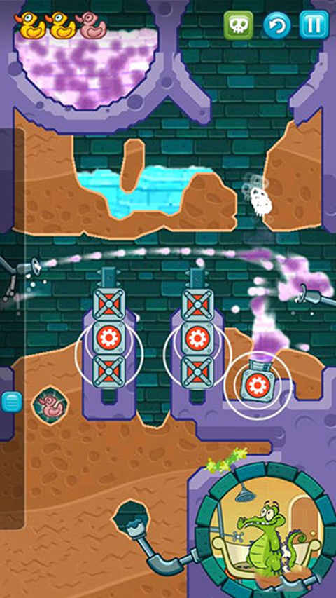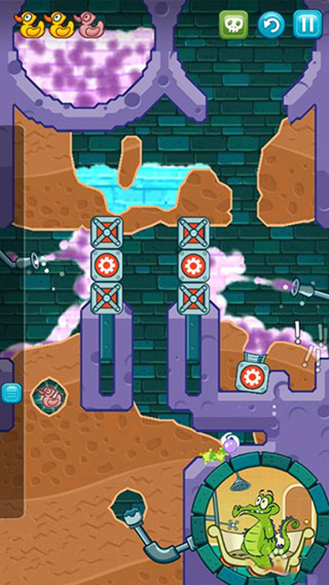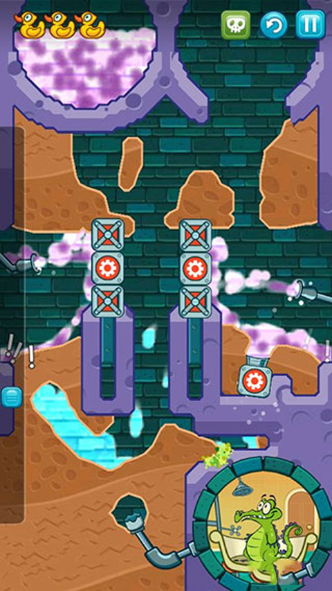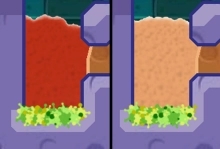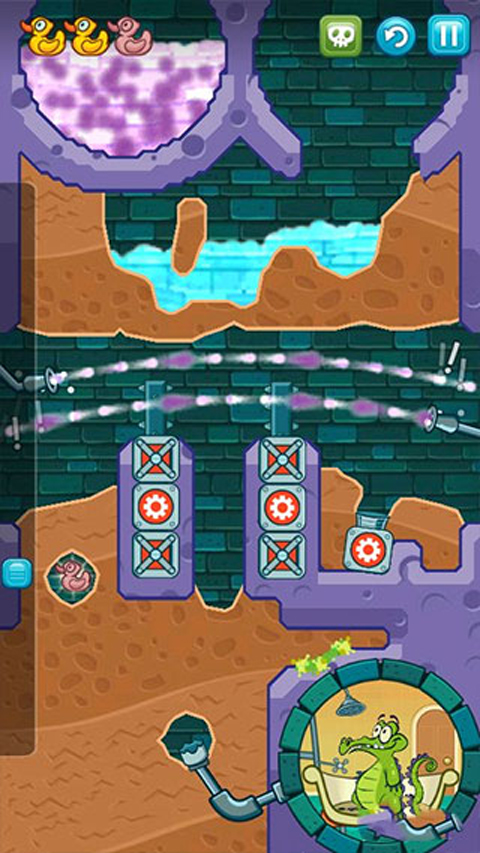 小鳄鱼爱洗澡2024中文最新版是一款非常有趣的趣味解谜游戏。游戏采用Q版卡通画风设计,适合休闲娱乐,让玩家帮助小鳄鱼成功洗澡。游戏关卡设置丰富,玩家需要通过灵活的反应躲避障碍和陷阱,利用道具解决问题,操作简单易上手。 游戏特色: 1、原创故事和人物,四个独特故事,超过500个谜题。 2、小顽皮的故事:帮助小鳄鱼解决水管问题,洗个舒服的热水澡。 3、爱丽的故事:帮爱丽得到所需水蒸汽,聆听她演奏经典音乐。 4、大顽固的故事:清理盘子周围的绿藻,让大顽固享用美食。 5、神秘鸭的故事:捉住神秘会瞬移的鸭子,挑战时间限制。 6、创意力学应用,形态各异的水源,发挥创造力解谜。 游戏玩法: 1、手划弄开屏幕上的泥土让水流动。 2、覆盖小黄鸭获取星级。 3、让足够的水流进小鳄鱼浴室的管道通关。 游戏优势: 1、挑战模式带来更多乐趣。 2、全新关卡设计,颠覆性的挑战。 3、多样化的故事情节和人物设定。 4、丰富的谜题和关卡设置,考验玩家的智力和反应能力。 5、简单易上手的操作方式,适合不同年龄段的玩家。 物体介绍: 【流动物体】 1、水 透明蓝色,小顽皮唯一可以用来洗澡、装鸭子的东西。遇到毒水(或被称为碱性水)就会变成毒水;遇到泥浆(或称酸性水)会同归于尽;遇到水藻,会被水藻吸收,水藻会生长;遇到熔岩会变成水蒸气;遇到泥巴就会变成泥巴并使泥巴增减新鲜度。(结构图颜色:43,33,254,RGB值10进制,下同) 2、毒水 透明紫色,又叫脏水。含碱,遇到水藻会与水藻同归于尽,遇到熔岩会变成水蒸气,遇到水会将其污染,遇到泥浆会引起爆炸并同归于尽;遇到泥巴会变成混凝土。(结构图颜色:139,25,135) 3、泥浆 绿色,半流体(液晶),又叫软泥,渗水。含酸,具有腐蚀土壤的作用。遇到毒水会小范围爆炸并同归于尽;遇到水藻会把水藻变成硬石头;遇到熔岩会与熔岩同归于尽;遇到气球会将其弄爆并消耗1滴泥浆;遇到水会同归于尽;遇到泥巴和混凝土也会同归于尽。(结构图颜色:190,101,47) 4、水蒸气 往上流动,可以穿过水藻和熔岩,遇到冰柱会变成水;遇到泥巴和混凝土会增加泥巴的新鲜度。无视其他液体和水藻、熔岩。如果气球包扎20滴以上蒸汽的话气球也会上升,如果有大量水蒸气也可以带动其他气球上升。(结构图颜色:0,3,143) 5、泥巴 新鲜的泥巴(左)和干燥的泥巴(右) 有新鲜度,新鲜的泥巴为深红色,不新鲜的泥巴为肉色,最后会变成可以手动凿开的土壤。保持新鲜的话,一是增加清水,二是让蒸气透过去,三是不让它接触石头和土壤。遇到泥浆会同归于尽。遇到毒水会变成泥巴,遇到熔岩无反应,能装进气球。另外,泥巴无视水藻,可以像气球一样在水藻上方。(结构图颜色:63,50,27) 6、混凝土(毒水和泥巴的混合物,已无法出现) 又叫水泥,跟泥巴相似,新鲜的混凝土为紫色,不新鲜的混凝土为浅紫色,最后会变成硬石头,保持新鲜的话,一是增加清水或毒水,二是让蒸气透过,三是不让它接触石头土壤。遇到泥浆会同归于尽,遇到熔岩会变成蒸汽,遇到泥巴会把泥巴变成混凝土,无视水藻,装进气球时仍为泥巴标志。但在1.10.0版本中,毒水遇到泥巴也会变成泥巴。 【结构物体】 1、土壤 肉色,可以手动凿开、被炸开,泥浆会腐蚀它(所有的鸭子也都可挖开土)。(结构图颜色:112,91,49) 2、硬石头 蓝灰色,凿不开,只能用炸弹或者毒水与泥浆组合来炸开(神秘鸭和巨鸭能凿开硬石头)。(结构图颜色:普通71,71,71,高光160,160,160,阴影40,40,40) 【开关物体】 1、开关 筒状开关(上)和按钮开关(下) 当水,毒水,泥浆或水蒸气碰到开关时同色的挡板(或风扇、吸水器)会触发某些事件。有2种开关:第1种是筒状的,不可关闭,触发会消耗1滴物质;第2种四周有按钮,有物质接触打开,物质移开则关闭。第2种开关也可以用气球打开。 2、挡板 普通挡板、无齿挡板和旋转挡板 同色、同图案的开关打开时挡板会触发某些事件,有旋转式和移动式。有些挡板不需要开关,自动运行。无尖齿轨道中的挡板表示停止控制时会归位。 3、手动挡板 移动式手动挡板(上)旋转式手动挡板(下) 手动操作的挡板,浅蓝色,有旋转式和移动式。有纹理的地方可以手动操作,有时有齿轮状的一端会作为轴心。 4、风扇 把流动物质(水、泥浆、毒水、蒸汽、泥巴)和气球吹到一个地方。 5、吸水器 把流动物质和气球吸收,但气球吸不进去,只会堵在入口。 6、轨道 有齿挡板(上)和无齿挡板(下) 挡板与手动档板在轨道上运行,无视其他任何物体,有尖齿的可以固定挡板,无尖齿的停止控制时会归位。 7、固定块 使旋转式手动档板在两个固定块内旋转活动,无视其他任何物体。 截流攻略: 1、首先打开小鳄鱼爱洗澡,进入3-6截流关卡,按图所示的一样引出污水将左边的炸弹引爆; 2、然后就将所有的污水都引入左侧这个刚炸开的“水缸”中; 3、上边的清水在左边预留一小部分水备用,然后就将剩余的水向右边引下,收集到第一只鸭子,落下又连环引爆两个炸弹; 4、当水到达如图所示的位置时,将上边预留的水放下收集到左上角的鸭子; 5、左侧水坑挖深一些,将左边水坑中的水引过来一些; 6、将右边的水放下启动红色开关,机关就会将两侧喷出的污水挡住,但有一点污水流了进来; 7、从右侧挖出一条小道将污水引至水藻处; 8、挖出如图一样的路来,将清水引下,收集到最后一只鸭子,最后将水引入小顽皮的浴室即可过关。 |