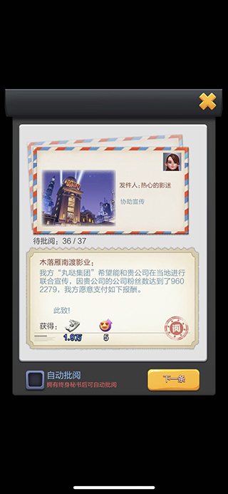 《票房大卖王》是一款由深圳欣欣互动科技有限公司打造的模拟经营游戏,玩家将扮演电影公司老板,在游戏中拍摄电影并提升票房,享受经营的乐趣。 游戏特色: 1、经营电影公司,从小影院开始,逐步踏上成功之路。 2、明星营销玩法,拍摄商业广告,选择超高人气艺人,提升电影知名度。 3、独特的模拟经营创新玩法,化身名导演,在影视圈创作属于自己的大卖作品。 4、创意电影拍摄模式,投资优质影视作品,扩大名气。 5、全球推广电影,征服全球市场,获得更多收益。 游戏亮点: 1、挑选海量剧本,搜罗神级剧本,拍摄大卖电影,赢得奥斯卡荣誉。 2、培养优秀演员,发掘潜力新人,打造顶尖电影阵容。 3、精心规划电影宣传,提升期待值,吸引更多观众。 4、体验真实电影制作过程,感受导演的乐趣与挑战。 5、与亲友合作,互相支持,共同创造票房奇迹。 游戏玩法: 1、经营电影公司,选择剧本,拍摄电影,提升影响力。 2、招募演员,培养演技,打造黄金阵容。 3、制定市场营销策略,提高电影期待值,吸引更多观众。 4、推广电影作品,征服国内外市场,实现票房大卖。 5、与好友合作,共同参与电影制作,取长补短,共享成功。 游戏优势: 1、丰富剧本选择,满足玩家不同口味,享受电影创作乐趣。 2、真实模拟经营体验,感受电影公司运营挑战。 3、多样化的营销策略,培养玩家市场推广能力。 4、与好友互动合作,增加游戏乐趣和社交体验。 5、精美画面表现,生动展现电影创作场景,让玩家身临其境。 |