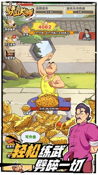 劈山大师免广告手机版是一款放置修炼功夫游戏,以劈砖为起点,玩家可以通过不断劈砍来解锁更多的功夫。游戏中还提供了各种千奇百怪的道具,玩家可以通过获取这些道具来突破自己的极限,并完成一系列的试炼挑战,最终成为真正的强者,劈开大山。 游戏特色: 1、百种道具,大开眼界:游戏中提供了各种练武道具,每一种道具都拥有独特而奇特的形态,玩家可以尽情尝试各种劈砍方式,挖掘更多的练武技巧。 2、开设武馆,广招学徒:玩家有机会在游戏中建立自己的武馆,并招收弟子。通过修建各类设施和招募学徒,玩家可以延续传承,成为闻名天下的大师。 3、各式各样的关卡挑战:游戏中设有丰富多样的关卡挑战,玩家可以不断解锁更多有趣的内容,发现更多精彩的故事情节,使游戏更加刺激有趣。 4、自创武学,力劈华山:玩家可以在游戏中自创武学,例如刮痧掌、铁头功、龙卷风腿等,通过不断修炼和磨练,最终成为人间兵器,劈开华山。 5、轻松的挂机玩法:游戏提供轻松的挂机玩法,即使在游戏闲置的过程中,玩家也能够获得奖励,解放双手,快速突破修炼。 游戏亮点: 1、独特创新的放置修炼玩法,让玩家在闲暇之余享受游戏的无压力乐趣。 2、百种道具的存在,让玩家可以不断尝试各种练武技巧,寻找最适合自己的劈砍方式。 3、建立武馆并招收学徒,玩家可以体验到成为大师的荣耀和自豪感。 4、丰富多样的关卡挑战,让玩家可以不断解锁更多有趣的故事情节,增加游戏的可玩性和挑战性。 5、自创武学的玩法,玩家可以尽情发挥创造力,创造出属于自己的独特武功,并劈开华山,成为真正的强者。 游戏玩法: 1、进入游戏后,点击任意位置开始练武的旅程。 2、通过劈断木板来完成第一个任务,并在左上角的任务栏领取奖励。 3、通过道具升级能够增加砖头数量和解锁其他道具。 4、通过力道升级来提升各项属性,但需要消耗经验值和元宝。 5、达到一定等级后,可以突破,突破后可以切换武功。 6、还有旁边的试炼、卜卦、日常任务等内容,需达到一定等级后才能解锁。 游戏优势: 1、独特的放置修炼玩法,让玩家可以在游戏的轻松氛围中享受修炼功夫的乐趣。 2、丰富多样的道具和武功选择,让玩家可以尽情发挥想象力和创造力,打造属于自己的绝世武功。 3、建立武馆并招收学徒,让玩家有机会体验成为大师的荣耀和成就感。 4、多样化的关卡挑战和故事情节,给玩家带来更多的挑战和乐趣。 5、轻松的挂机玩法,让玩家可以在游戏闲暇的同时获得奖励,无需过分投入时间与精力,同时也极大地提升了游戏的可玩性。 |