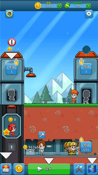 采矿大亨官方版是一款放置挂机类模拟经营手游,玩家可以扮演一名挖矿工,开采各种矿产,不断升级发展,最终成为一名矿场大亨。游戏采用Q版卡通风格,操作简单易上手,让玩家可以轻松享受挖矿的乐趣。 游戏特色: 1、放置挂机类玩法:游戏不需要玩家花费太多时间,可以轻松放置挂机,享受数钱的乐趣。 2、投资经济:玩家可以投资经济提升自己的财富,但也要注意风险。 3、招募经理:招募经理可以提升挖矿效率,让玩家更快速地累积财富。 4、管理多个矿山:玩家最多可以管理15个矿山,需要合理运用资源进行管理。 5、无需网络或氪金:游戏支持离线收益,让玩家可以尽情畅玩而不受网络或氪金影响。 游戏亮点: 1、简单易上手:游戏操作简单,适合各种年龄层玩家。 2、多样化挖矿内容:游戏中有各种矿产可以开采,让玩家体验不同的挖矿乐趣。 3、经理系统:雇佣经理可以让玩家更轻松地管理矿山,提升效率。 4、挑战多样性:有不同难度的矿洞可以挑战,让玩家有更多目标和挑战性。 5、离线收益:游戏支持离线收益,让玩家在不玩游戏时也能获得收益。 游戏玩法: 1、挖掘矿石:通过点击矿工进行挖矿,获取矿石并加工成金币。 2、升级经济:不断升级挖矿工人和设备,提升挖矿效率和收益。 3、雇佣经理:雇佣经理可以自动监督工人工作,提升生产效率。 4、管理矿山:管理多个矿山,合理分配资源以获得更高的收益。 5、挑战矿洞:尝试挑战不同难度的矿洞,获取更丰厚的奖励。 游戏优势: 1、简单易上手:操作简单,适合休闲玩家。 2、多样挖矿内容:有多种矿产可供挖掘,让玩家体验不同挖矿乐趣。 3、经理系统:雇佣经理提升工作效率,让玩家更轻松管理矿山。 4、多样挑战:有不同难度的矿洞可以挑战,增加游戏乐趣和挑战性。 5、离线收益:支持离线收益,让玩家在不玩游戏时也能持续获得收益。 新手怎么玩: 1、首先根据新手指引点击地下矿中的穿黄色衣服的矿工,然后他会进行挖矿,挖好矿后会背到左边靠近电梯的小箱子里面,这时点击在电梯中的红色衣服矿工,他会把箱子里面的东西传送到上方机器里面,然后点击在地面推小车的红衣服矿工,他会推着小车到机器下面接金币,送到原地。这三个矿工的规律性比较强,下面黄色的矿工可以一直进行挖矿,然后电梯里的矿工只需要吧挖好的矿石进行往上运送即可,地面上的工人,在机器下接住矿石推回原地就可以获取金币。 2、升级是大家比较关心的一个问题,升级在右下方黄色找人挖金矿那里,只要金币足够,上面就会有向上的箭头提示,然后就可以进行升级。随着级别的升高,所挖出来矿石的金币也会随着升高,最初1级的时候一次挖11个金币,到5级的时候一趟就可以挖取29个金币。升级的越快,所获得的金币就越多! 3、升级到5级的时候,大家就可以雇佣经理了,矿区经理,电梯经理和地面经理,都是一百金币,经理的作用就是一直监督工人干活,可以使玩家们不用一直点击工人干活,这个时候挂机他们也会自动干活。随着矿区2的开采,经理的雇佣价格也会相应的变高。矿屋1等级为10的时候,地下的矿中就会出现两个黄色衣服的矿工,一次可挖94个金币的矿石。 4、电梯运输和地上的运输工需要480个金币才能进行升级,可升级运输速度,运输量,运输工人数等等。在玩家们攒够金币后即可开始升级。 5、当经理头上出现小锤子的图案时,点击小锤子可以对开采的矿工进行加速,不过只有60秒的加速时间。黄色的矿工的箱子里最多可以装1k的金币,电梯的也是,地上推小车的矿工也同样。 6、把屏幕往下滑,下面都是未开采的矿区,矿区2在你收集到1k金币后就可以开启。所开放的矿区越多,你收集的金币也就越多,当你雇佣了经理后,矿区就会一直开采,你离开游戏以后,矿区经理会进行监督,你回到游戏界面以后点击收集,你离开是所开采的金币就会全部被收集。 7、在矿区2开启后,商店里面的博士会送给新手一个2倍金币的收集卡,使得金币收集的速度加快提升! 8、游戏中的超级现金是需要用人民还购买的哦!不是人民币玩家的宝宝们,还是老实点,省着点花系统送给你们的超级现金吧! |
